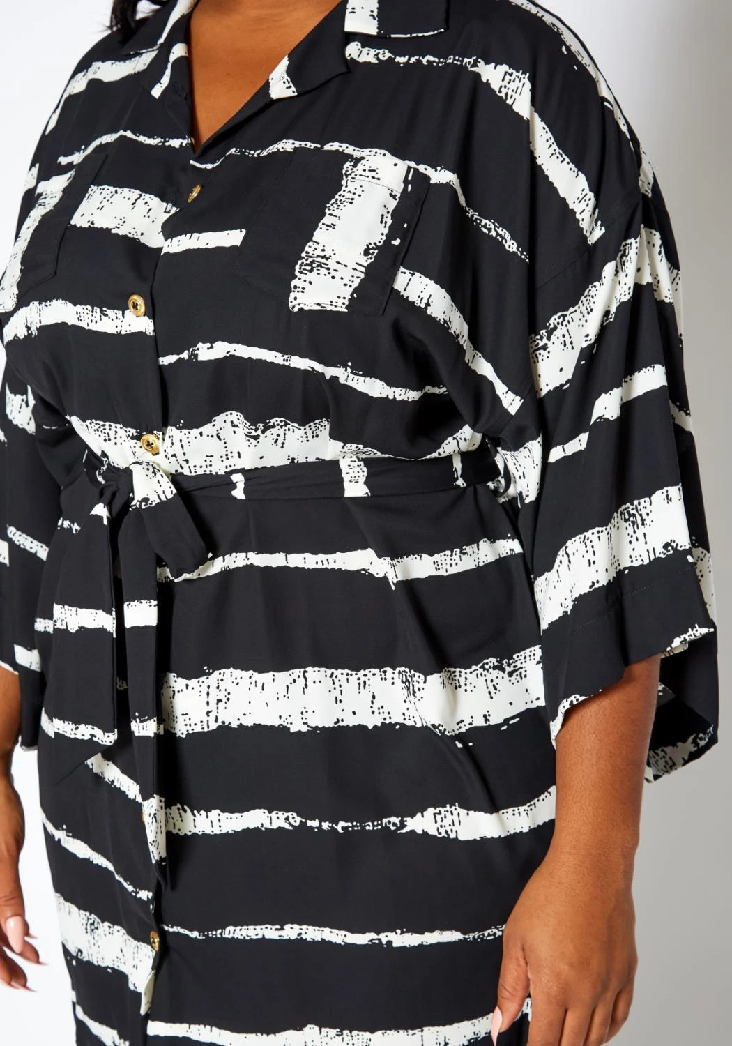 Plus size women’s abstract striped print mini dress in collar neck style, button front closure, flared short sleeves, curved hem and matching waist tie ascent.