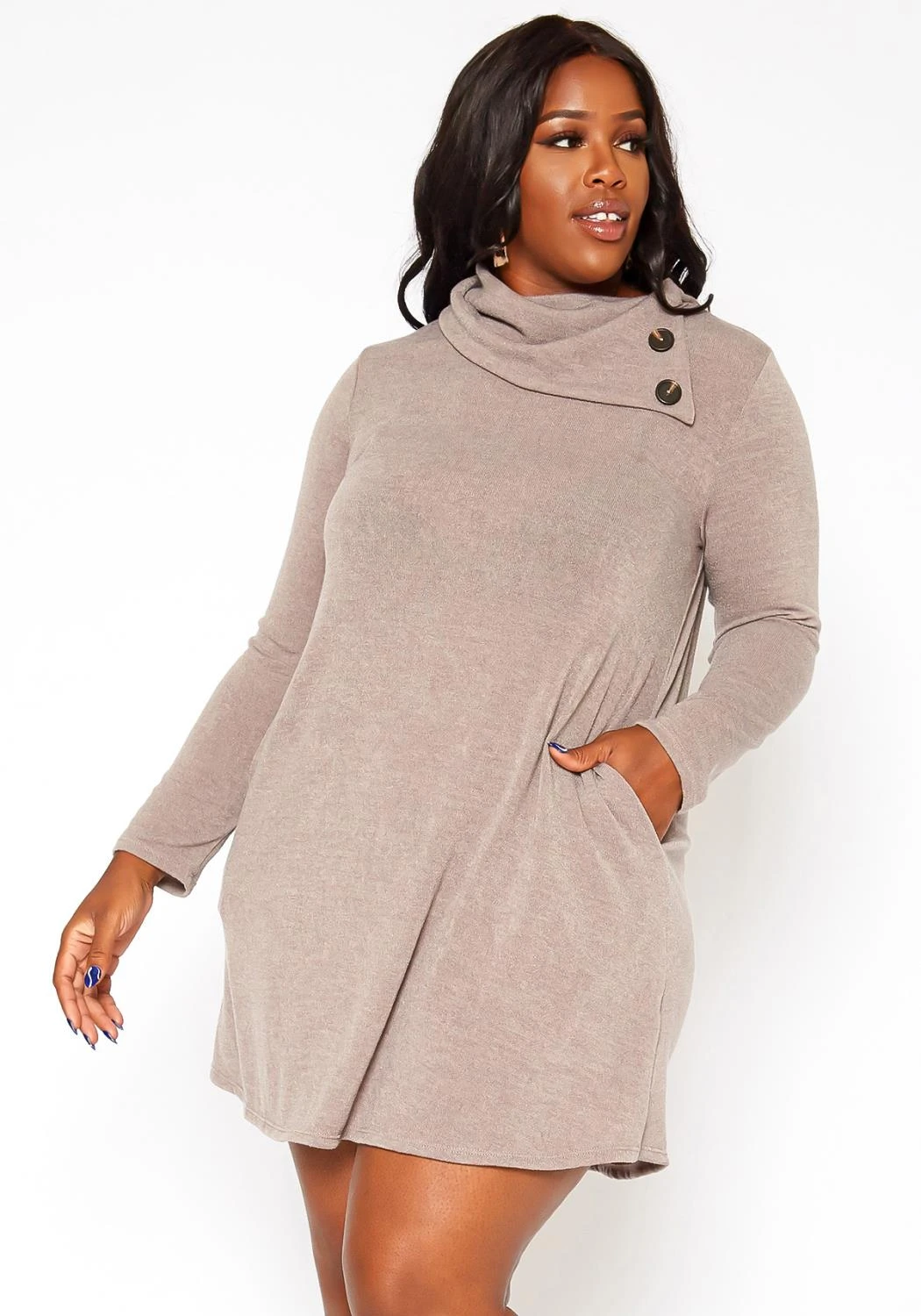 Chic mini dress for plus size women which features a asymmetric cowl neck style, button hem, fitted long sleeves, pocket ascent and knit material.