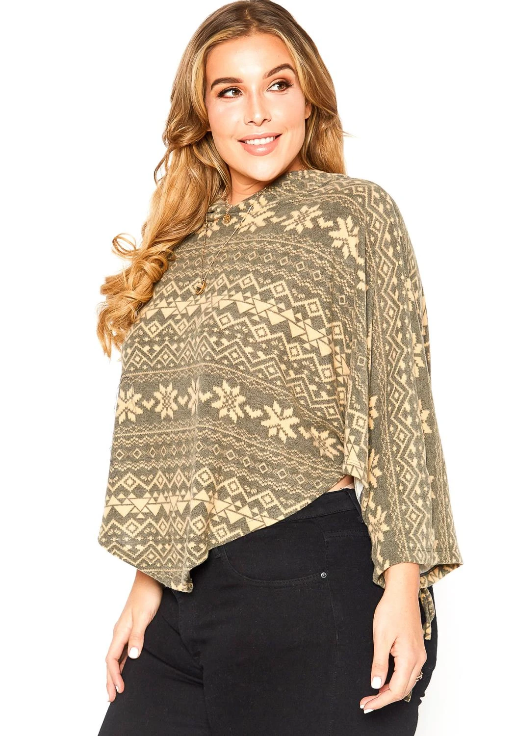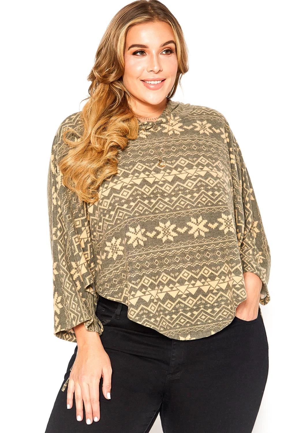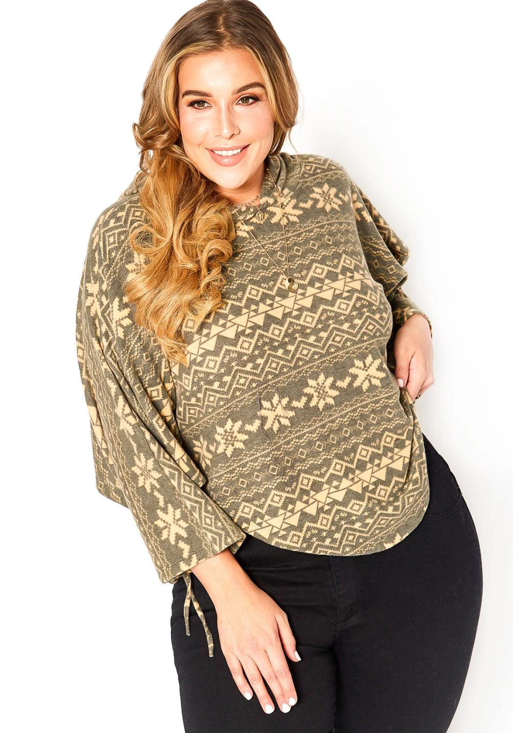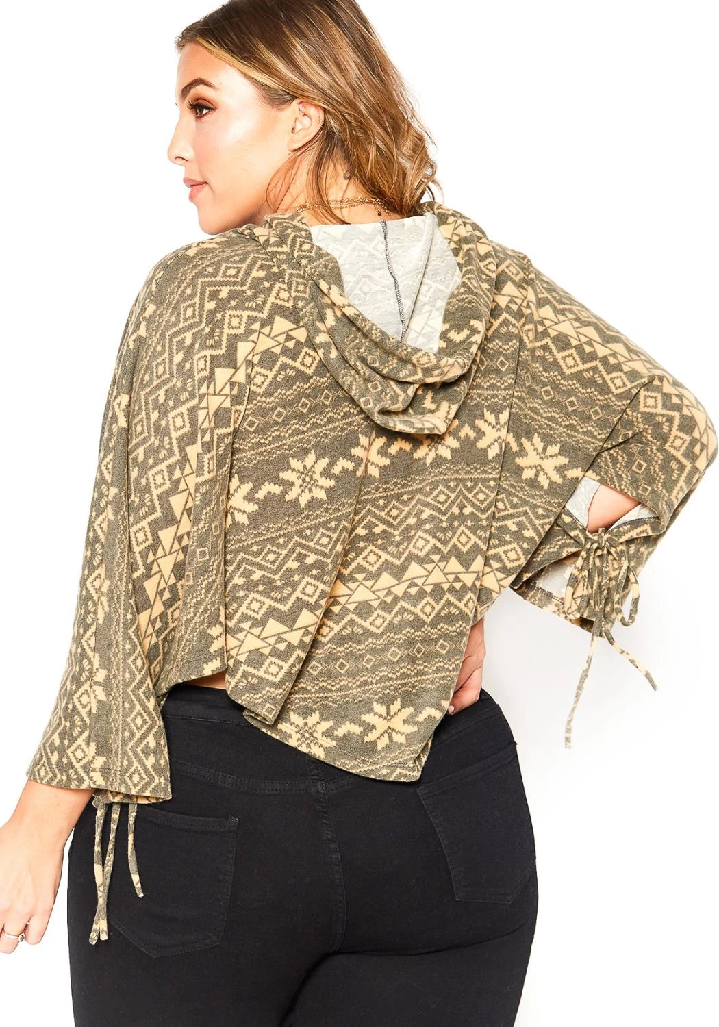 Features hooded style, aztec print, dolman sleeves with tie ascent, curved hem and crop fit.