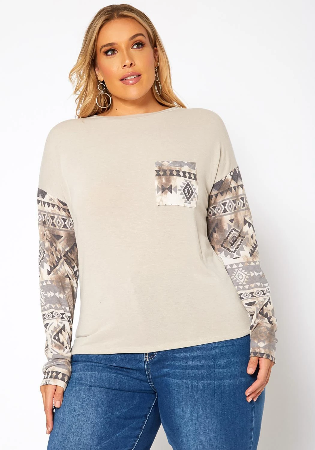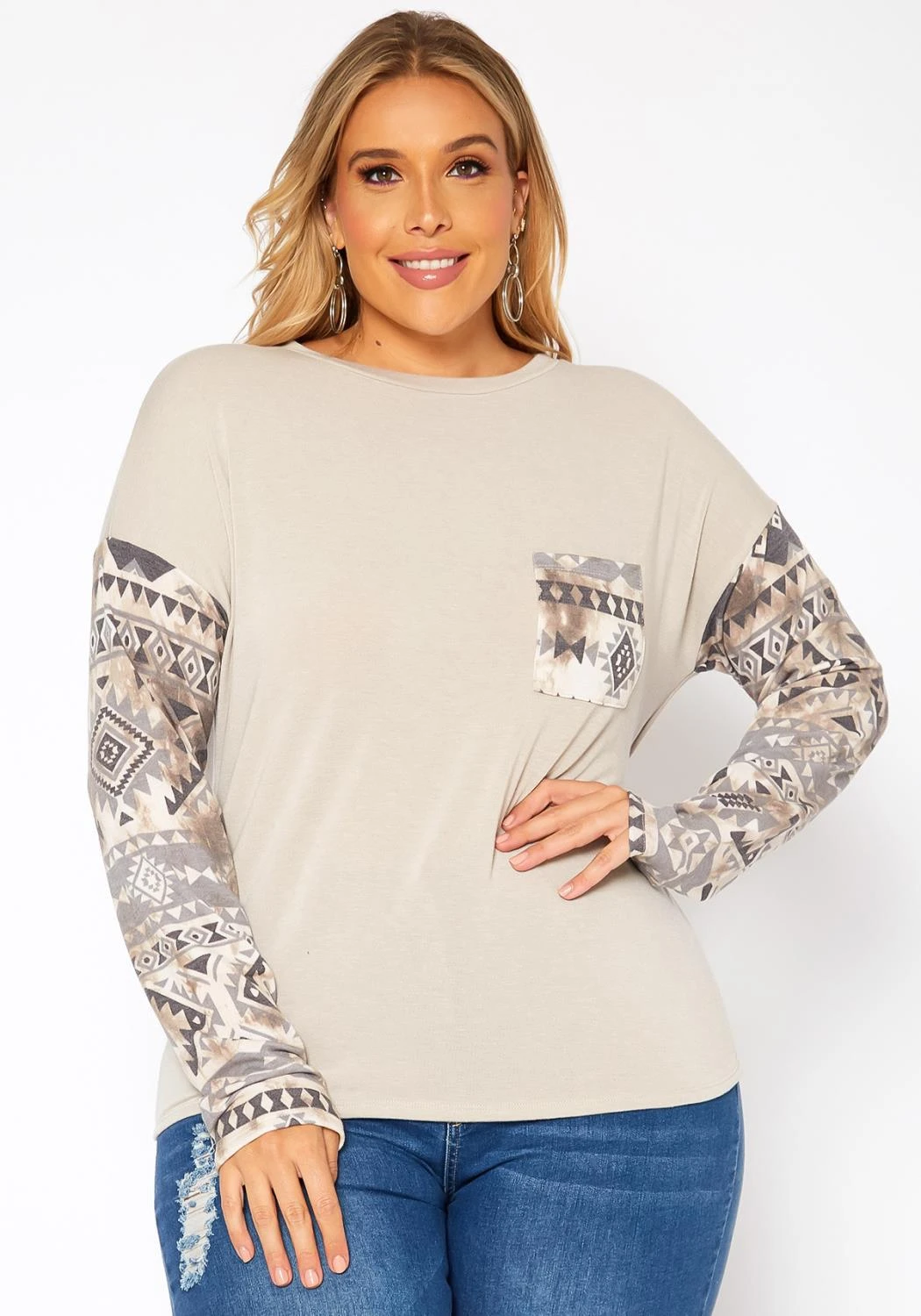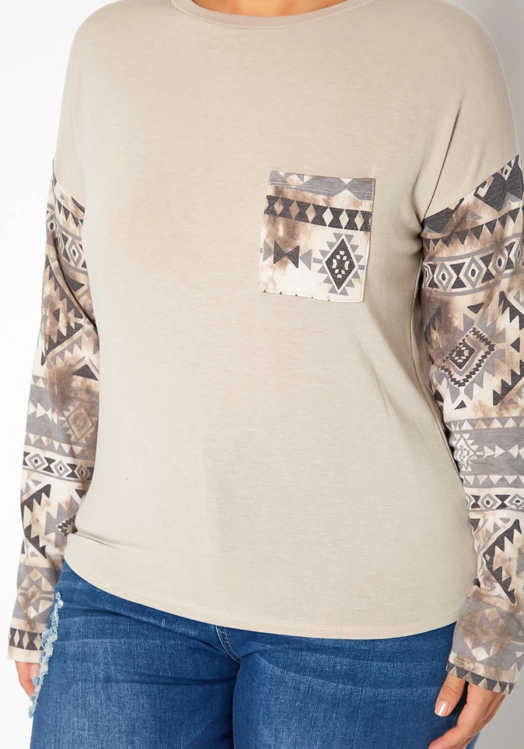 Casual plus size women’s top with aztec pattern, long sleeves, pocket front and crew neck style.