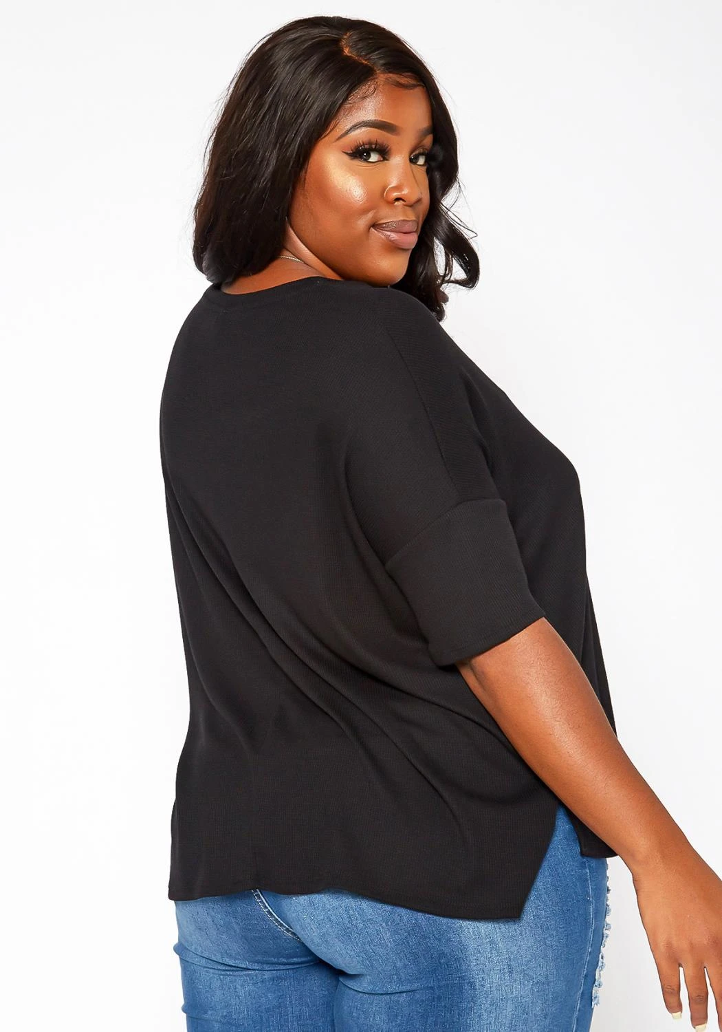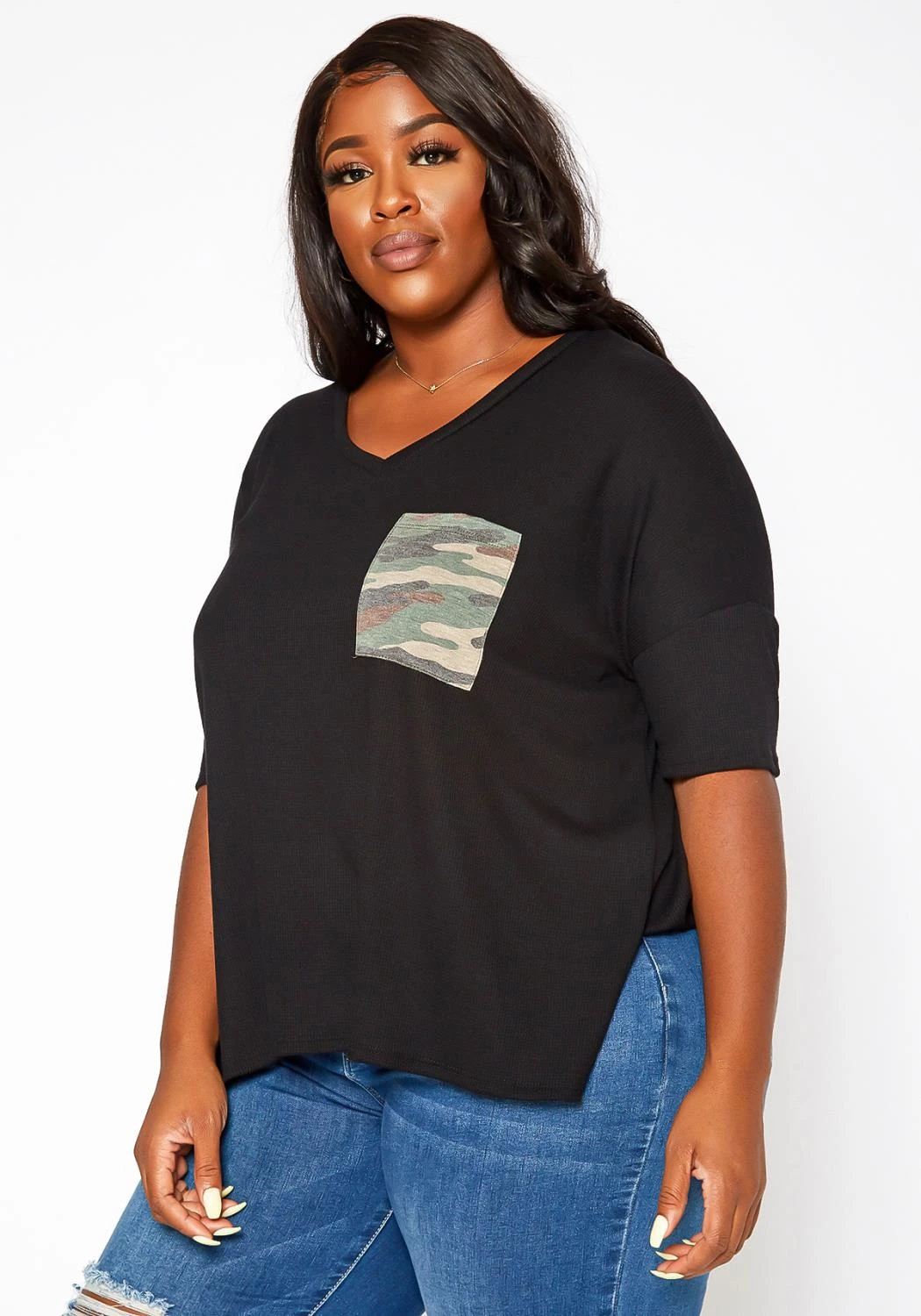Plus size women’s basic, waffle knit t-shirt in v-neck style, camo print pocket hem, drop short sleeves and side slit hem.