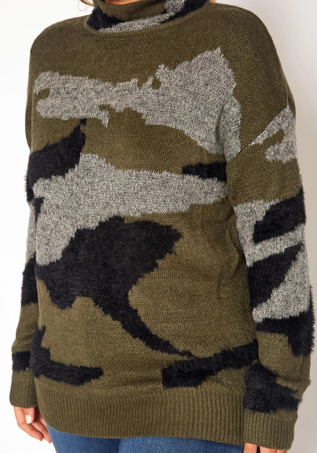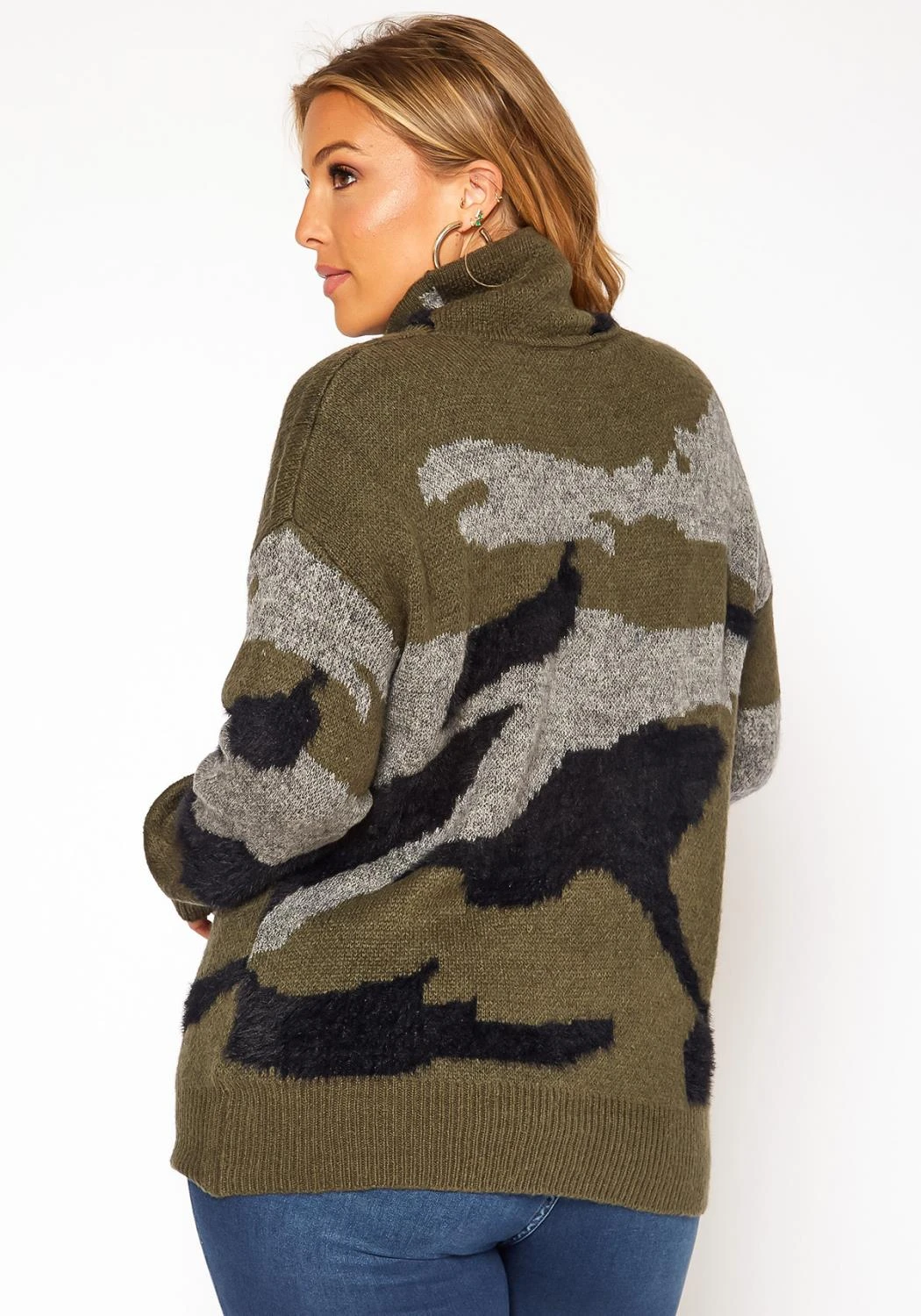 Cozy plus size women’s knit sweater in camo print, turtleneck style and drop shoulder long sleeves.