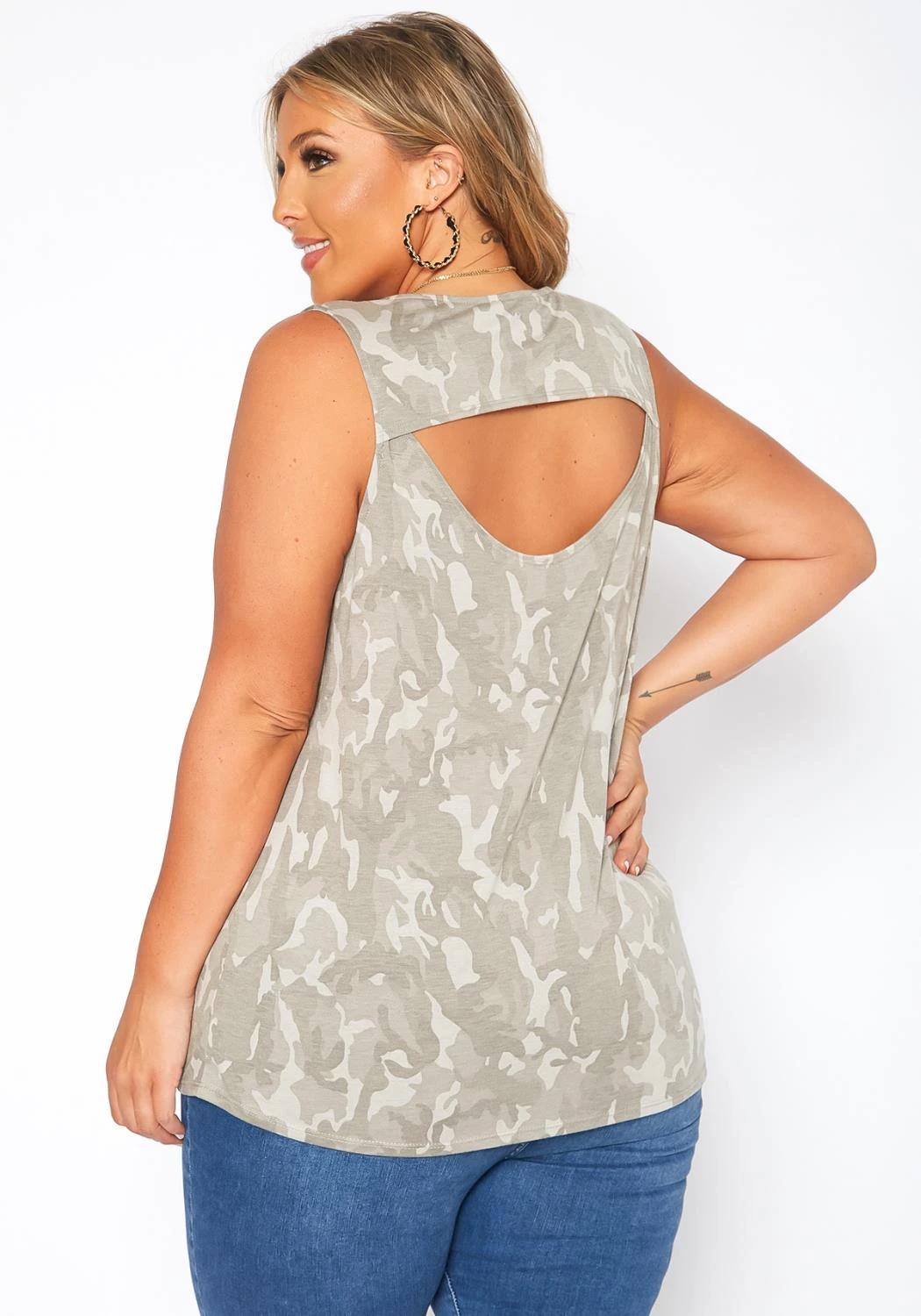 Casual plus size women’s tank top in camo print, round neck style and open back cut-out hem.