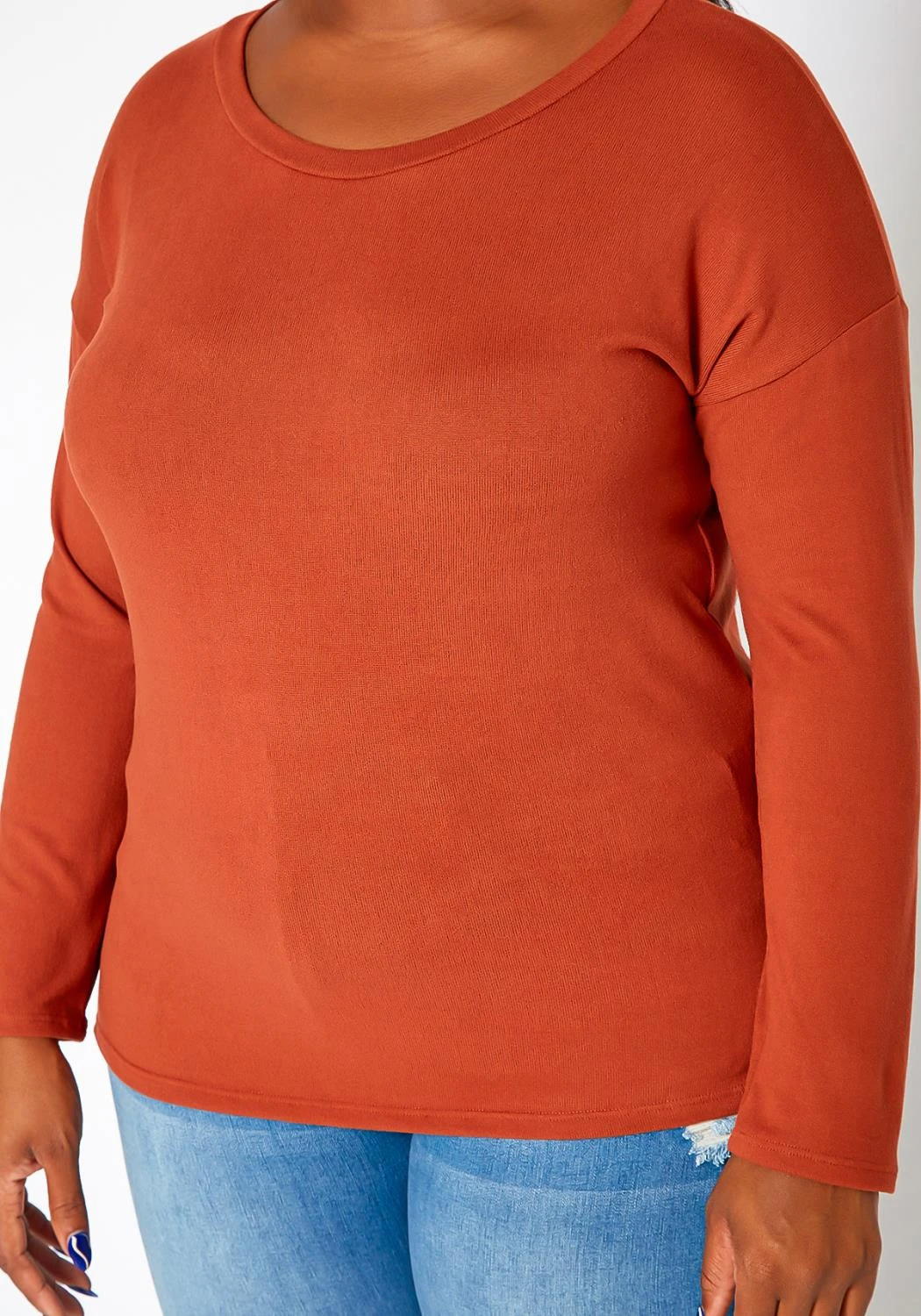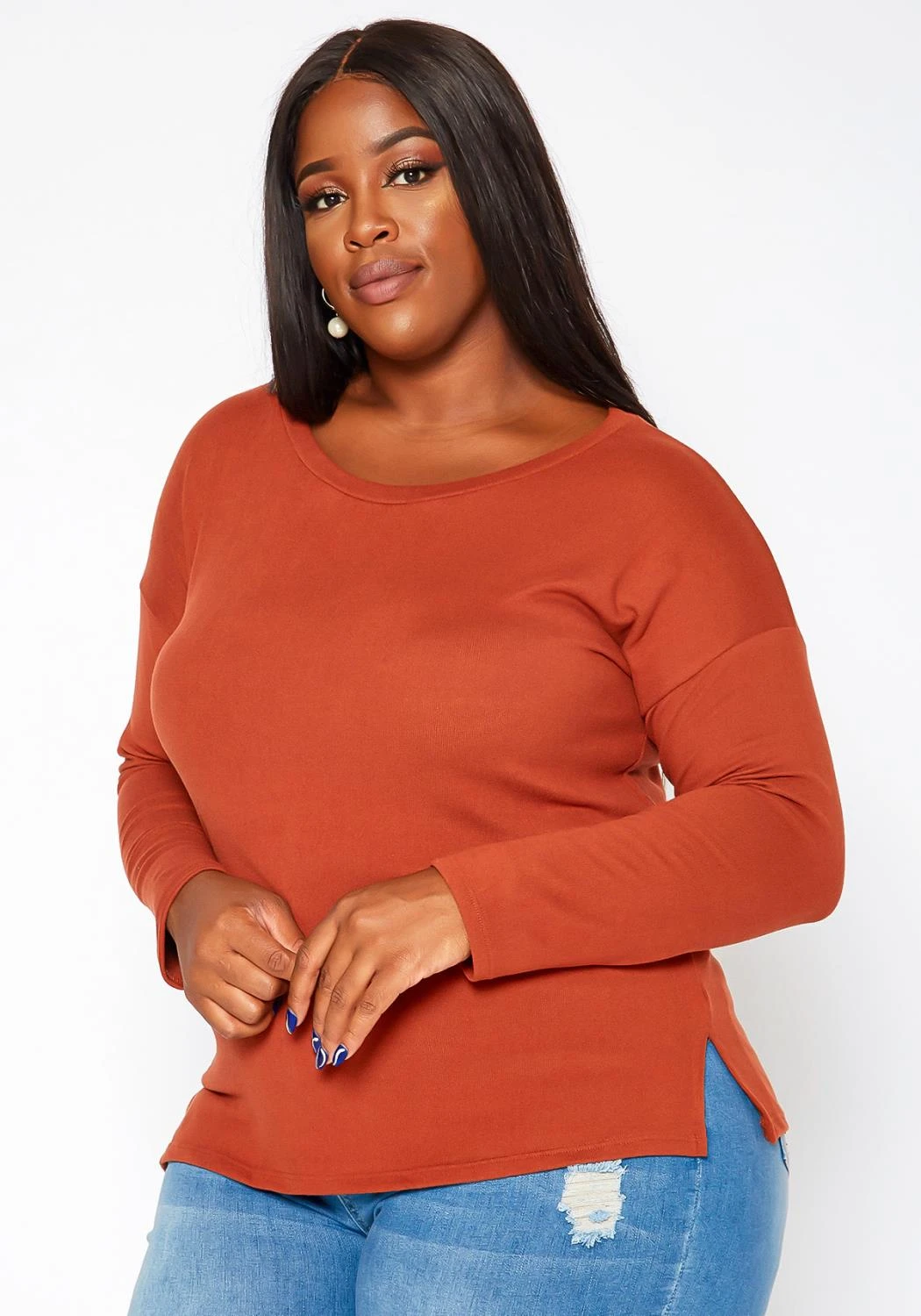 Plus size women’s essential long sleeve top in casual crew neck style, slim fit and side slit hem design.