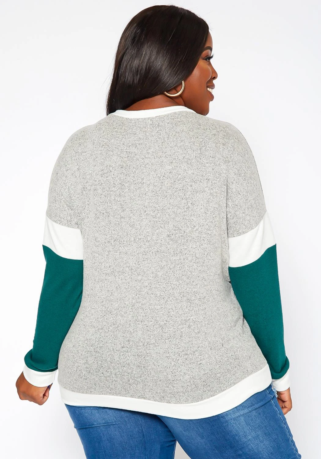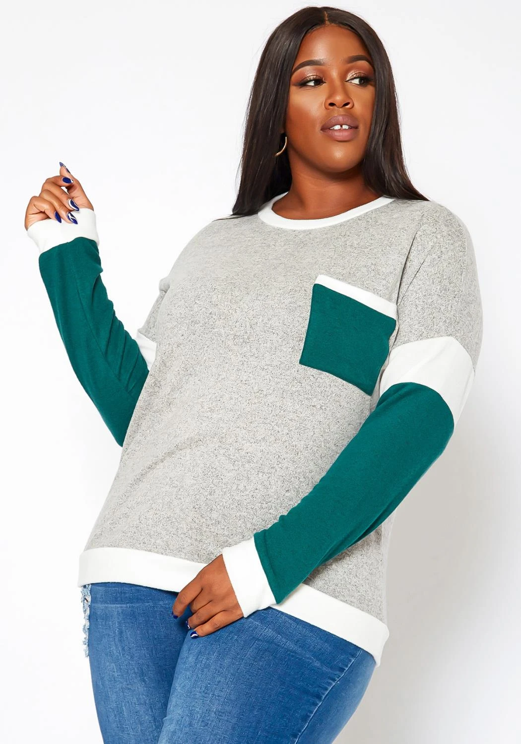 Casual plus size women’s knit sweater in crew neck style, color block design and pocket hem.