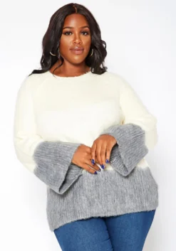 Cozy plus size women’s knit sweater in color splice design, crew neck style and angel flare long sleeves.