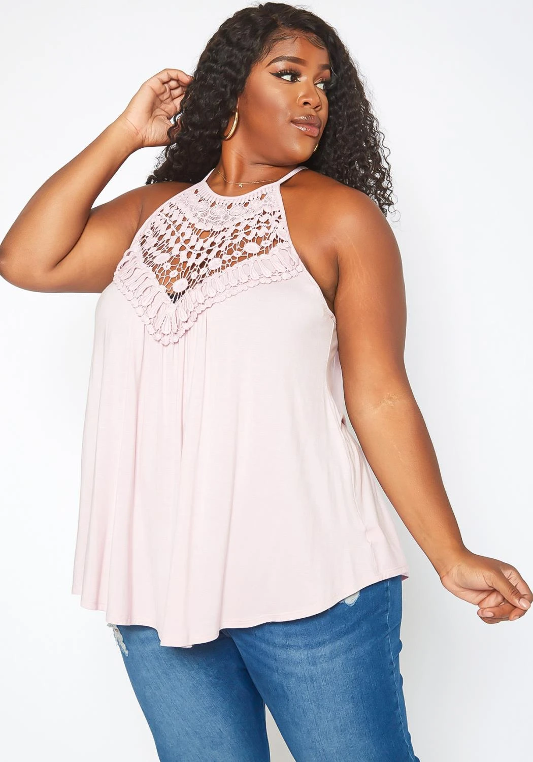 Perfect spring fashion top with crochet design, halter neck, back button closure and flare end.