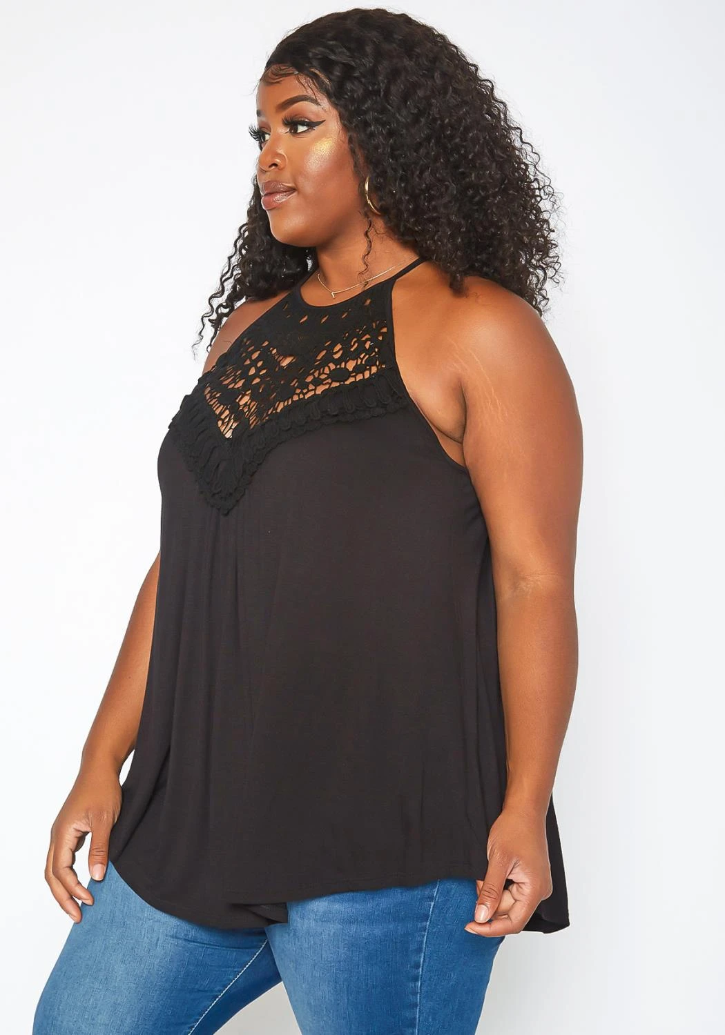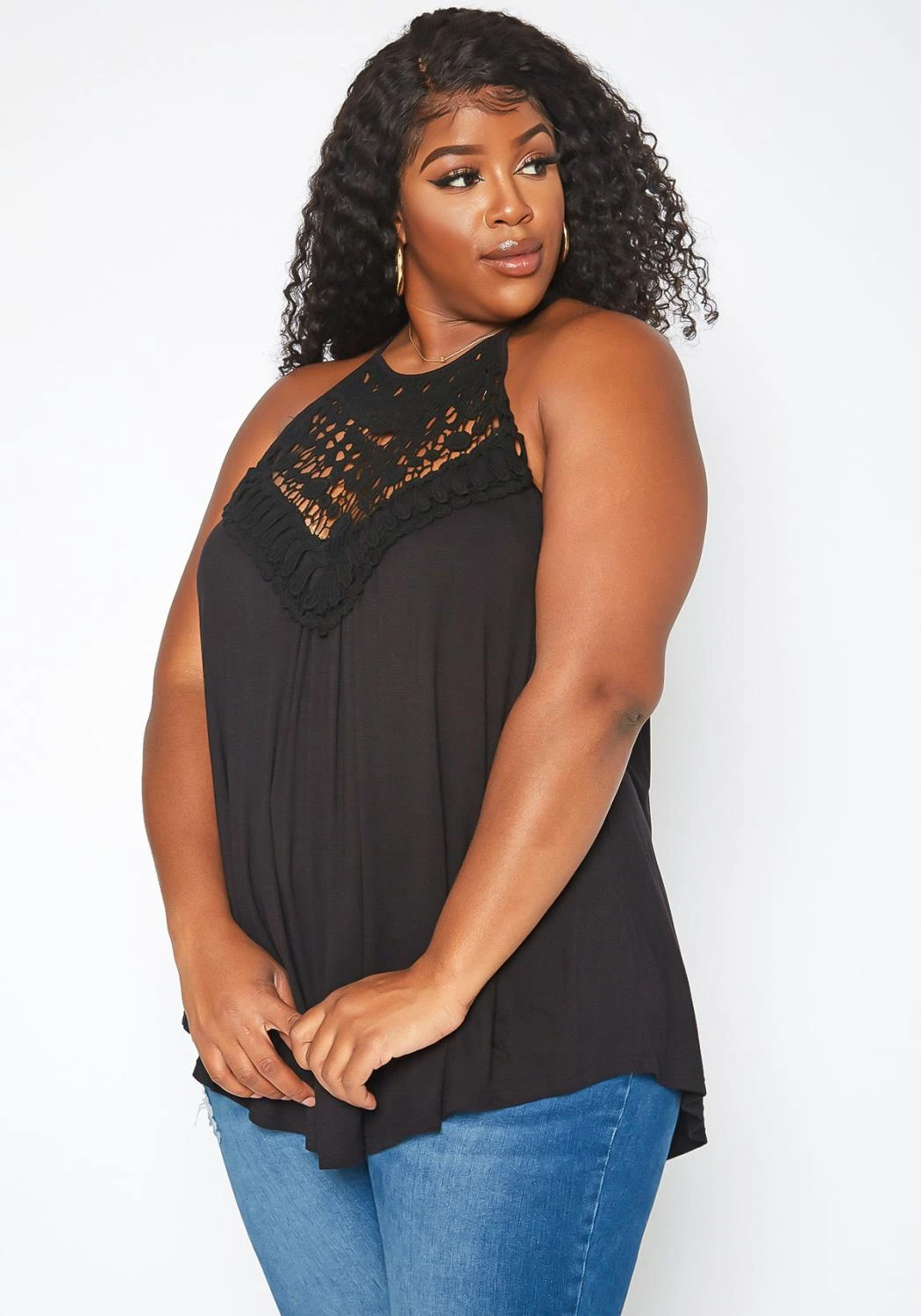Perfect spring fashion top with crochet design, halter neck, back button closure and flare end.