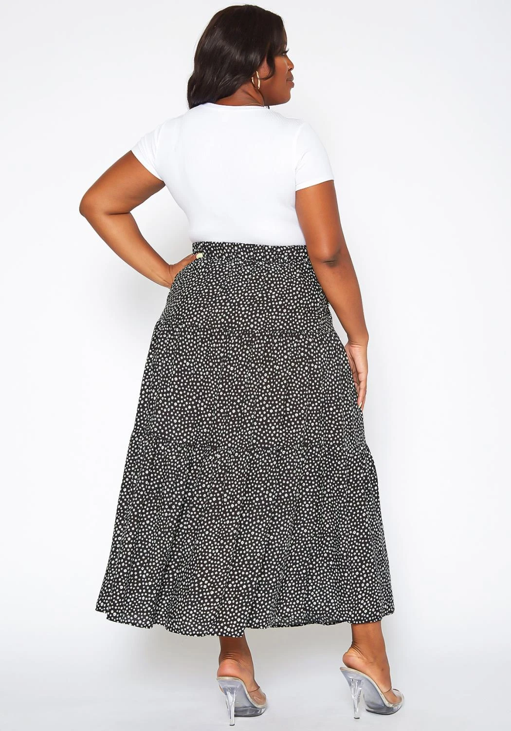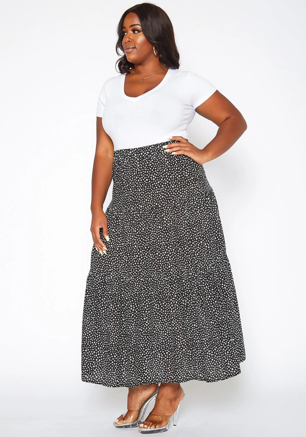 Lovely maxi skirt for plus size women in dainty floral print, high waist style, tiered design and wide flare.