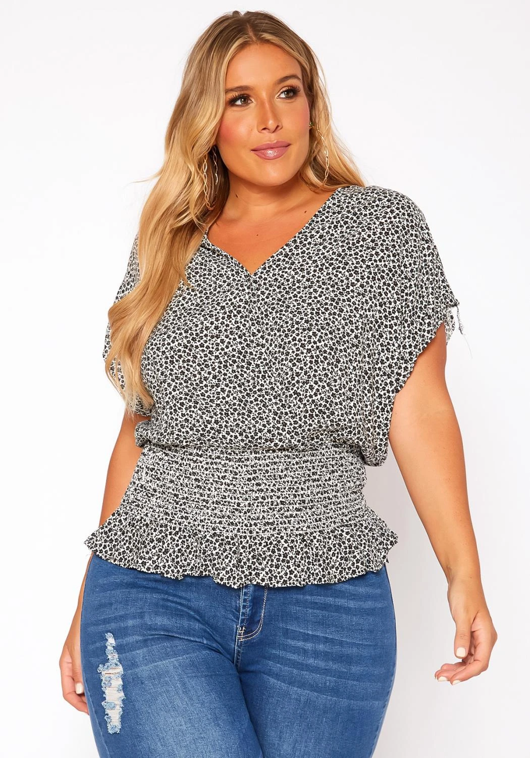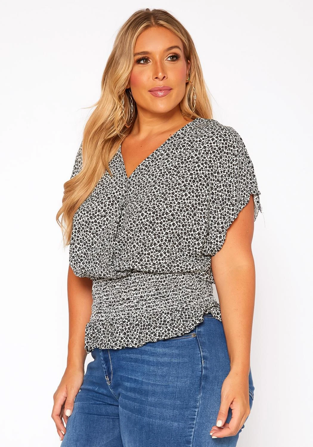 Lovely plus size women’s blouse in dainty floral print, v-neck style, smocked waistline, dolman short sleeves and ruffle flare.