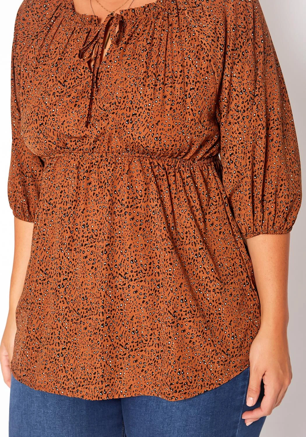 Fresh plus size women’s dainty leopard print top with half sleeves, waistline elastic hem, flare hem and tie front neckline ascent.