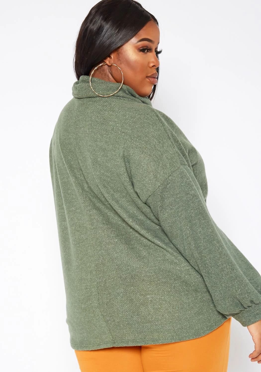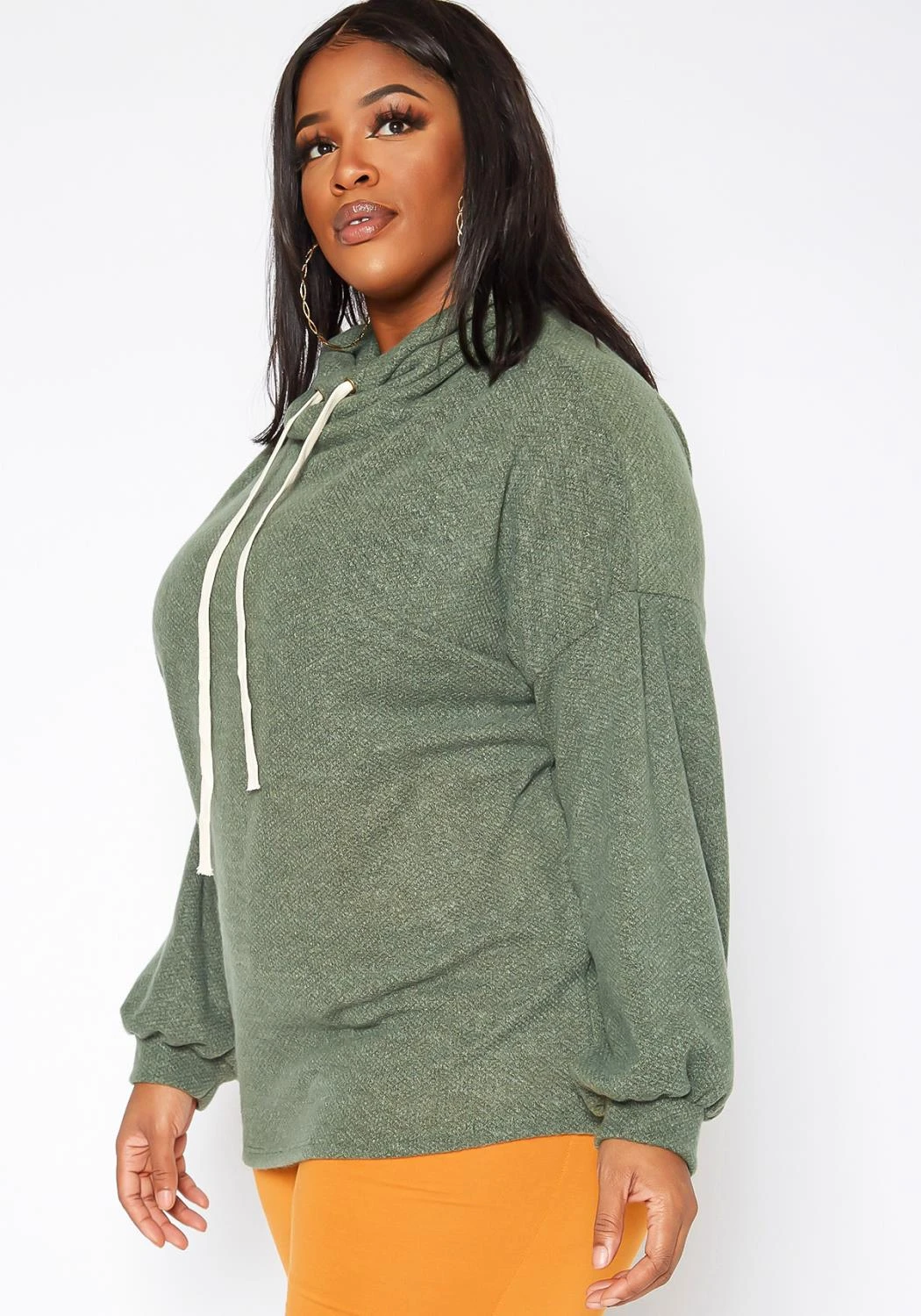 Plus size women’s casual lounge in sweater in unique funnel neck style, white drawstring hem and puffy long sleeve with fitted wrist cuffs.