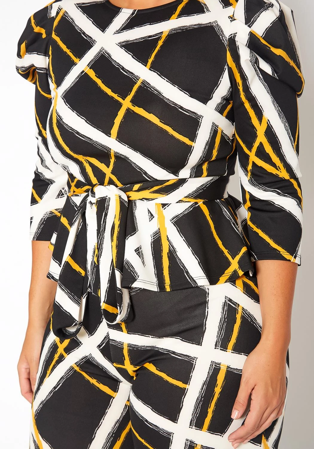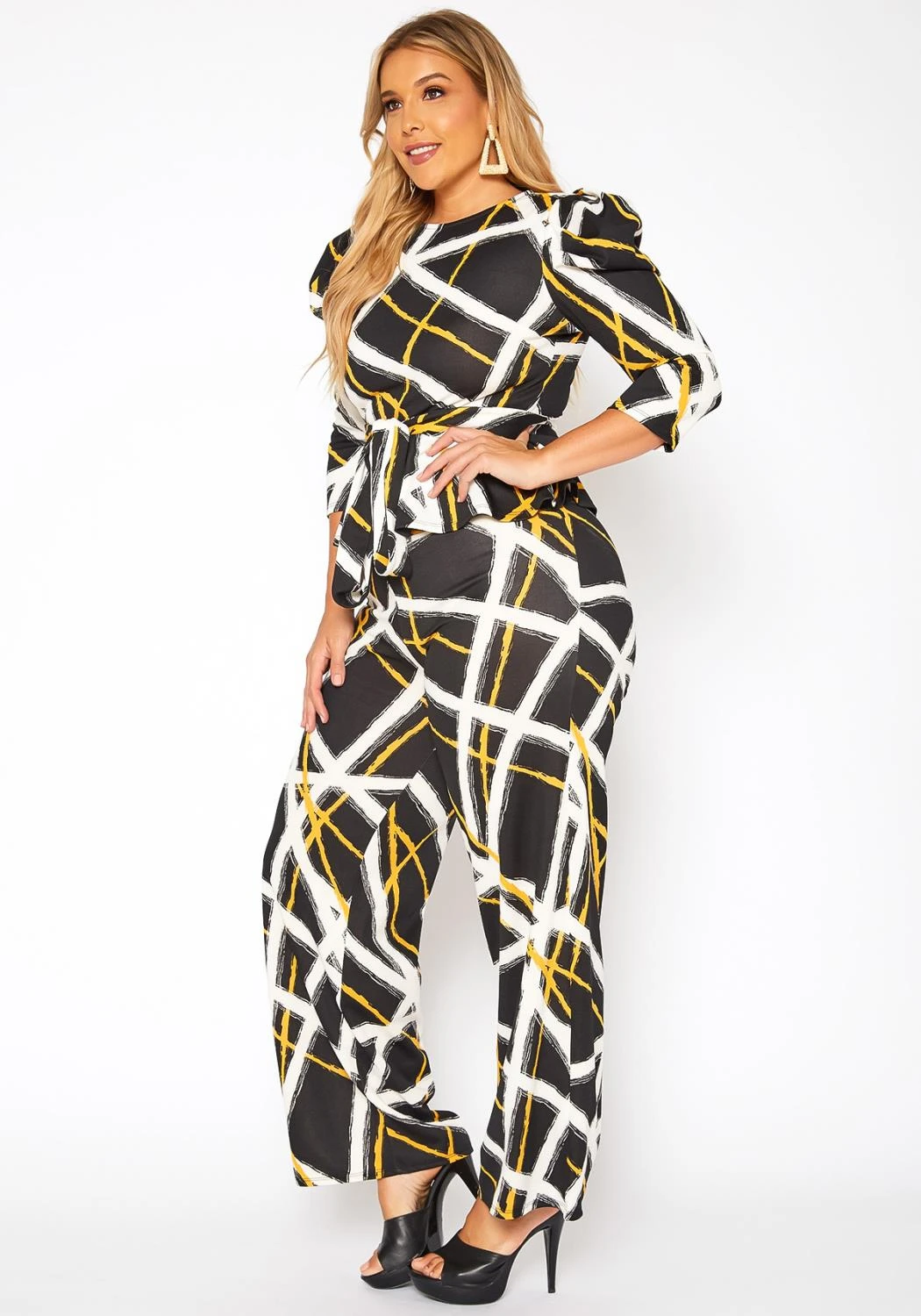 Statement plus size women’s matching set in grid striped pattern. Features belted, half sleeve peplum top and straight pants set.