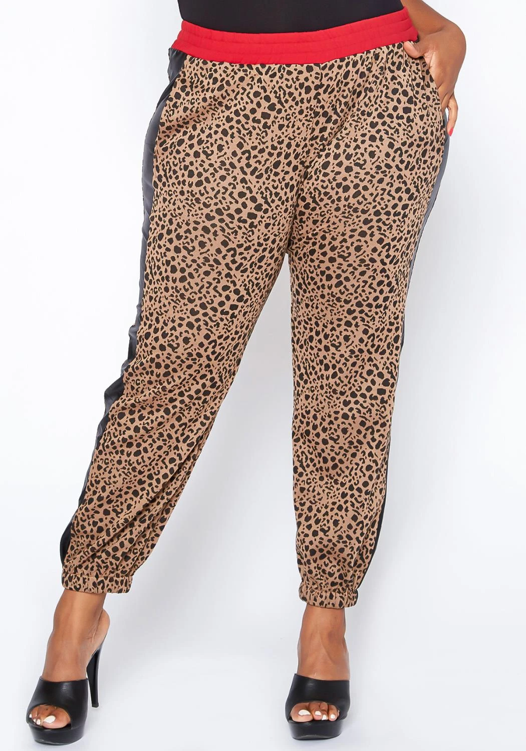 So stylish plus size women’s jogger pants in leopard print design, faux leather tape line, red waistline trim, cuffed ankle hem and pocket ascent.