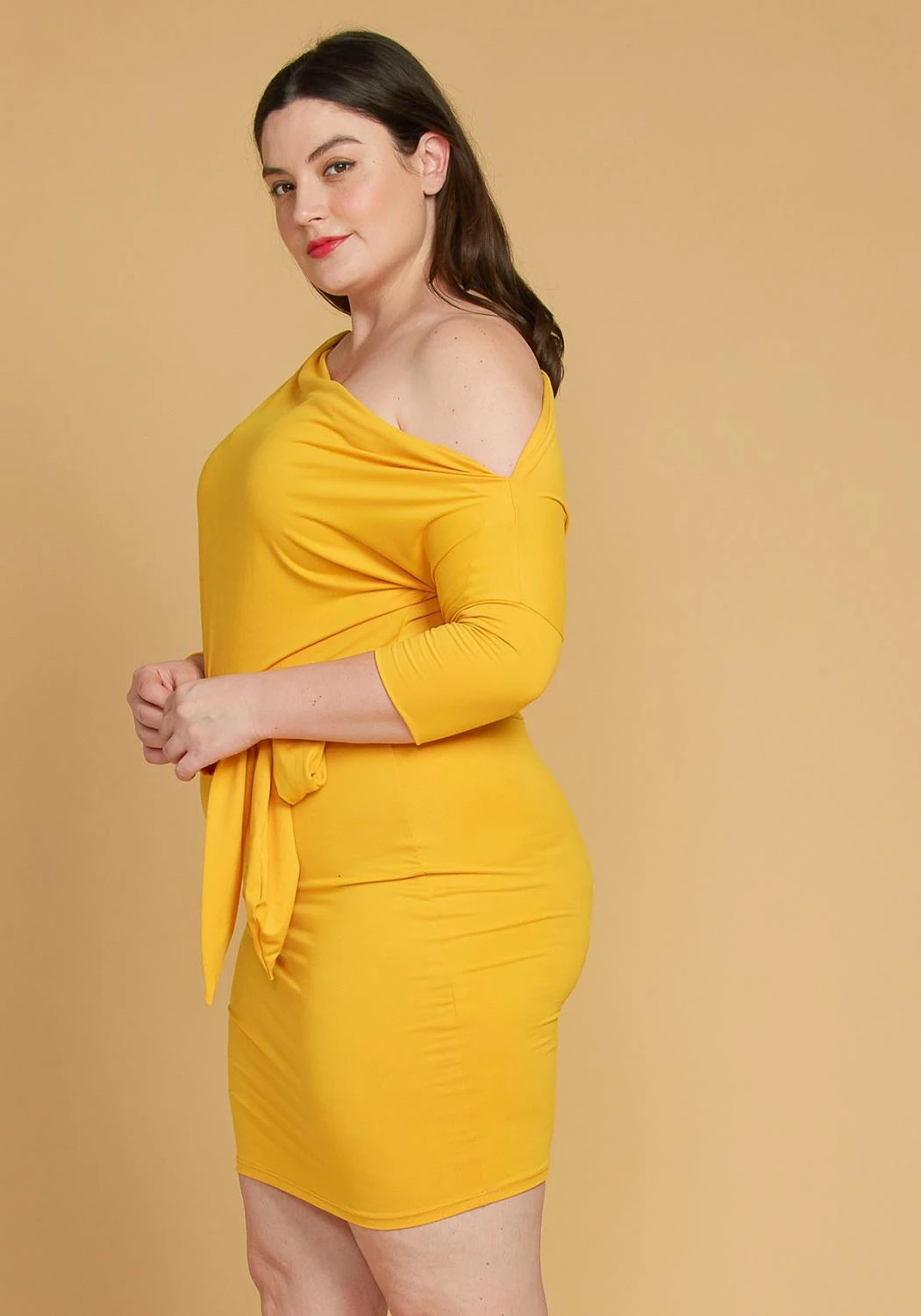 Cute one shoulder bodycon dress with batwing sleeves and tie waistbelt.