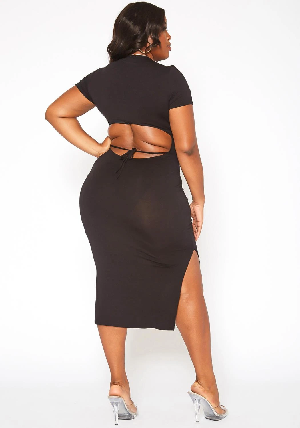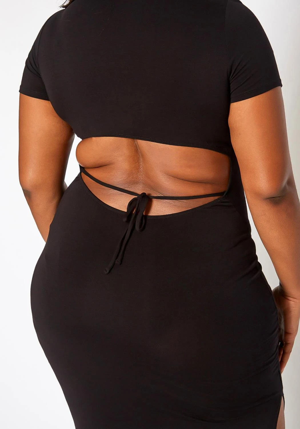 Upleveled basic plus size women’s midi dress with open back design, back tie closure, round neck style, short sleeves and bodycon fit.