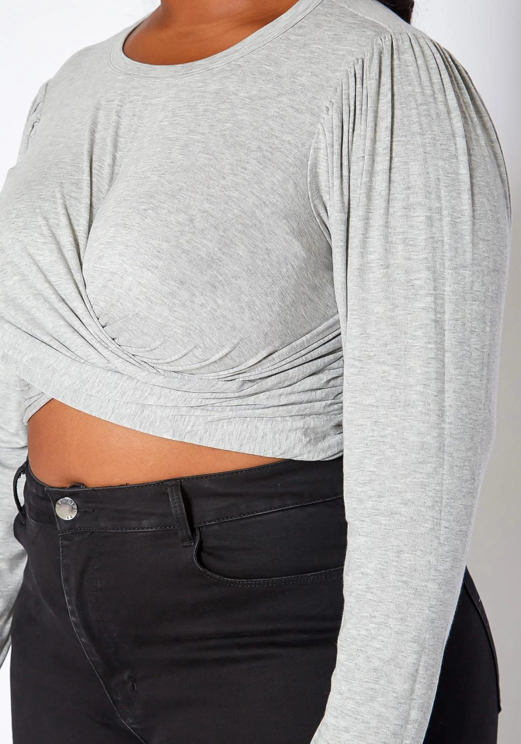 Fashionable plus size women’s crop top in ribbed knit material, crew neck style, fitted long sleeves and overlapping twist hem design.