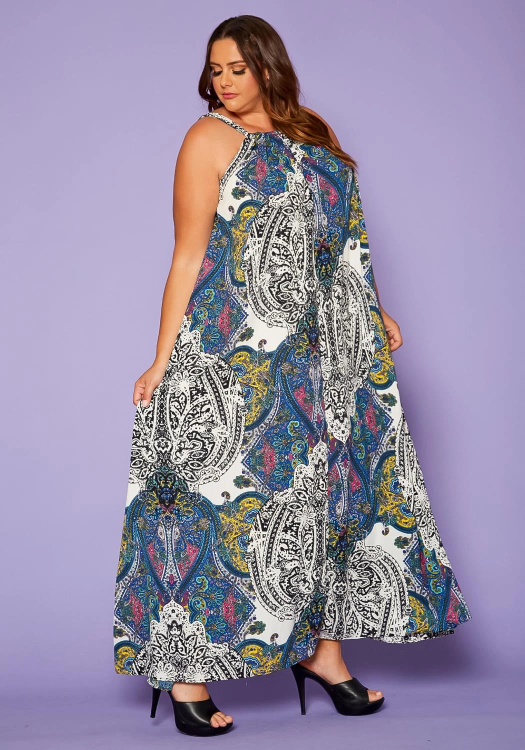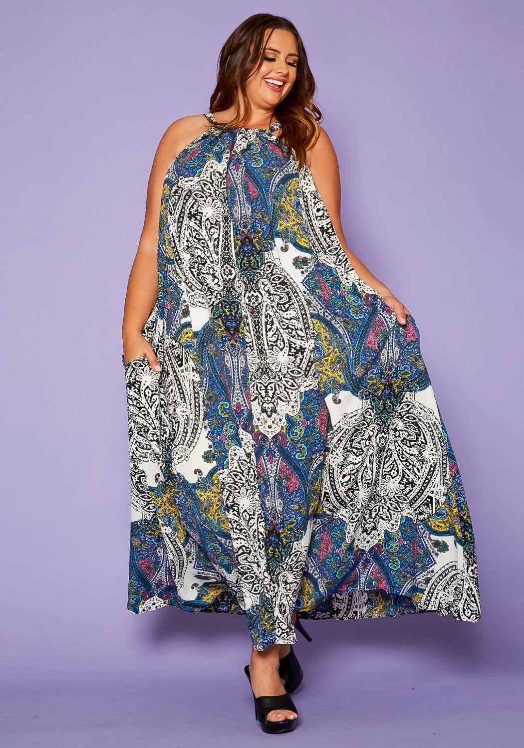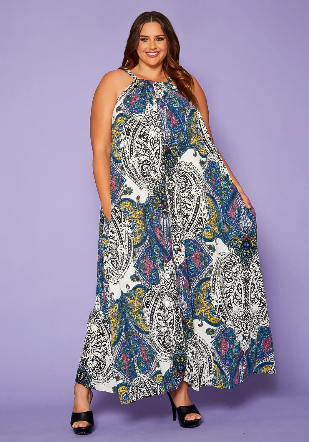 Delightful plus size women’s maxi dress in paisley pattern, sleeveless design, halter top hem, fit to flare end, pocket ascent and back tie closure.