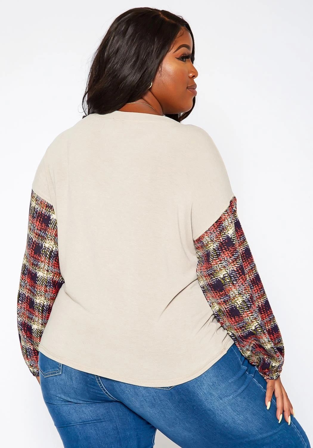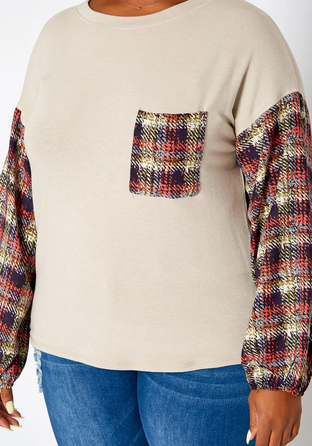 Casual and chic plus size women’s sweatshirt in plaid print contrast long sleeves and pocket hem, crew neck style and elastic wrist cuffs.