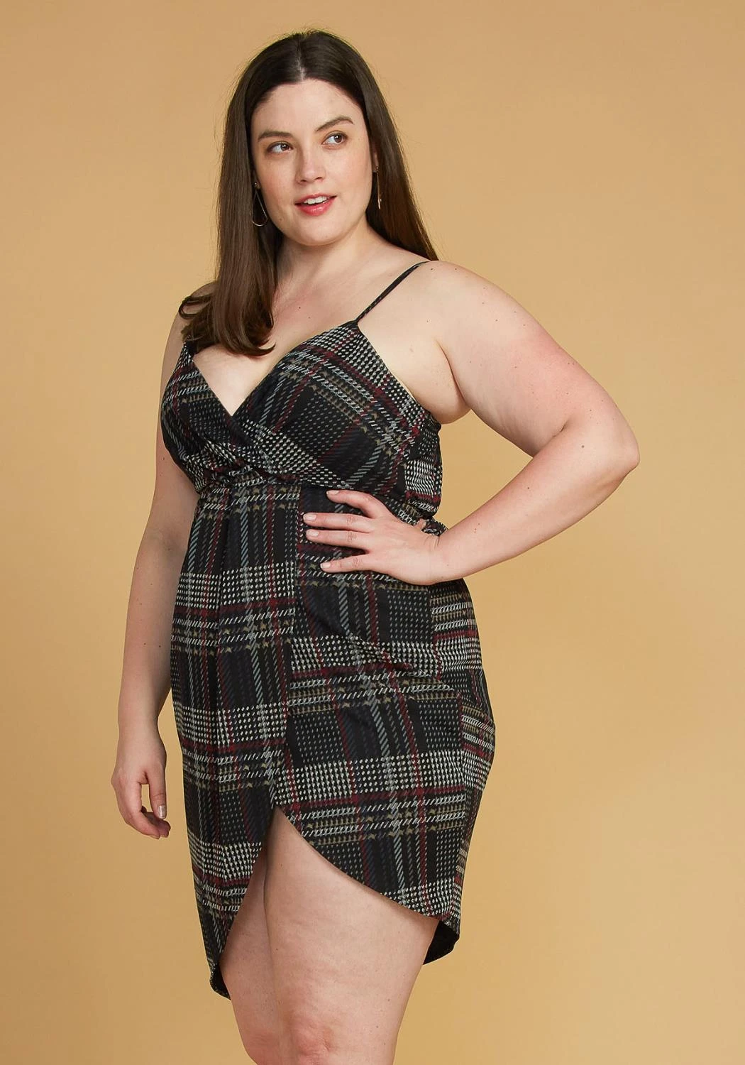 A simple, plaid, surplice dress with a tulip hem.