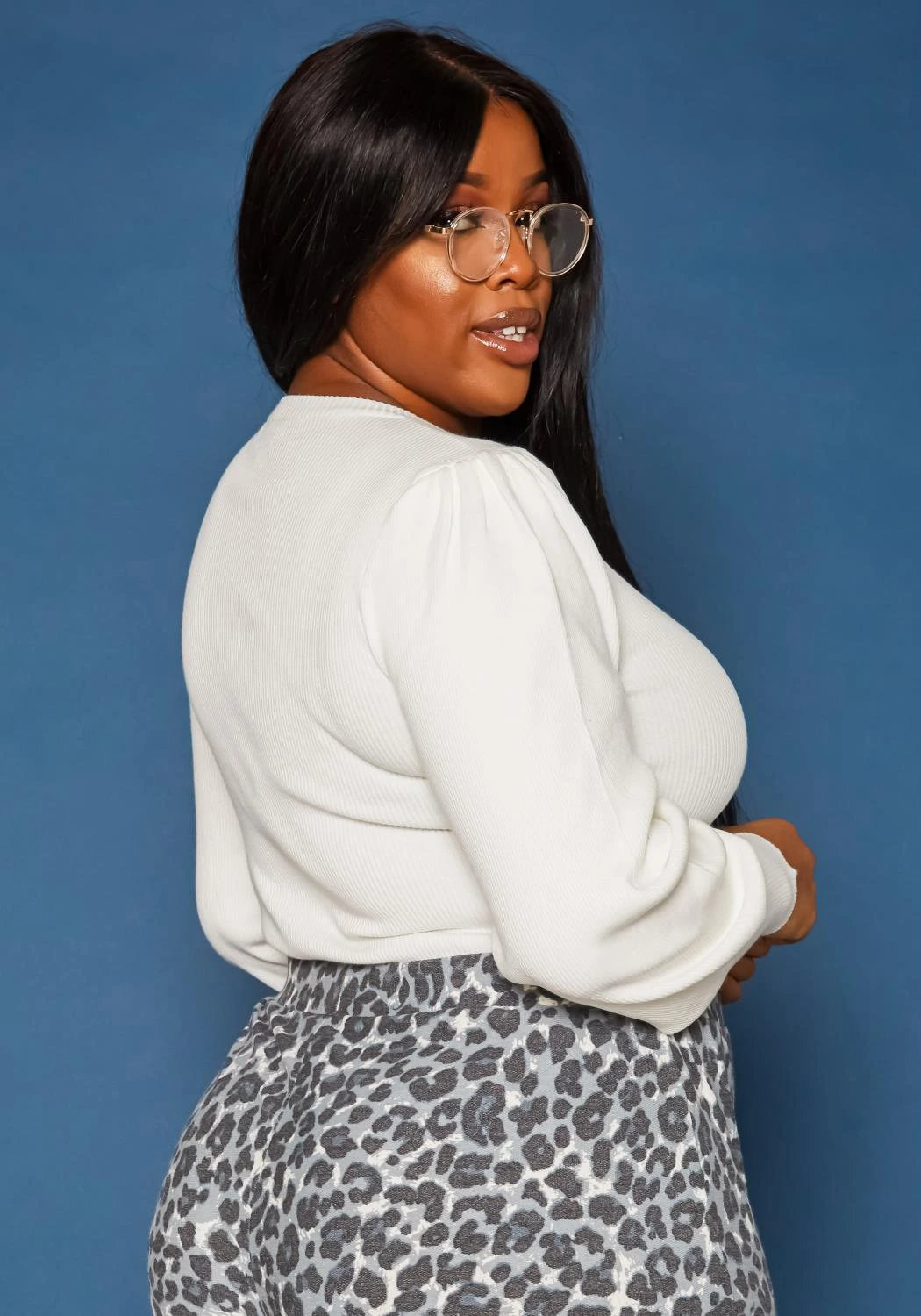 Cute winter essential fashion top in ribbed knit material, crew neck style, puffy long sleeves and fitted wrist cuffs.
