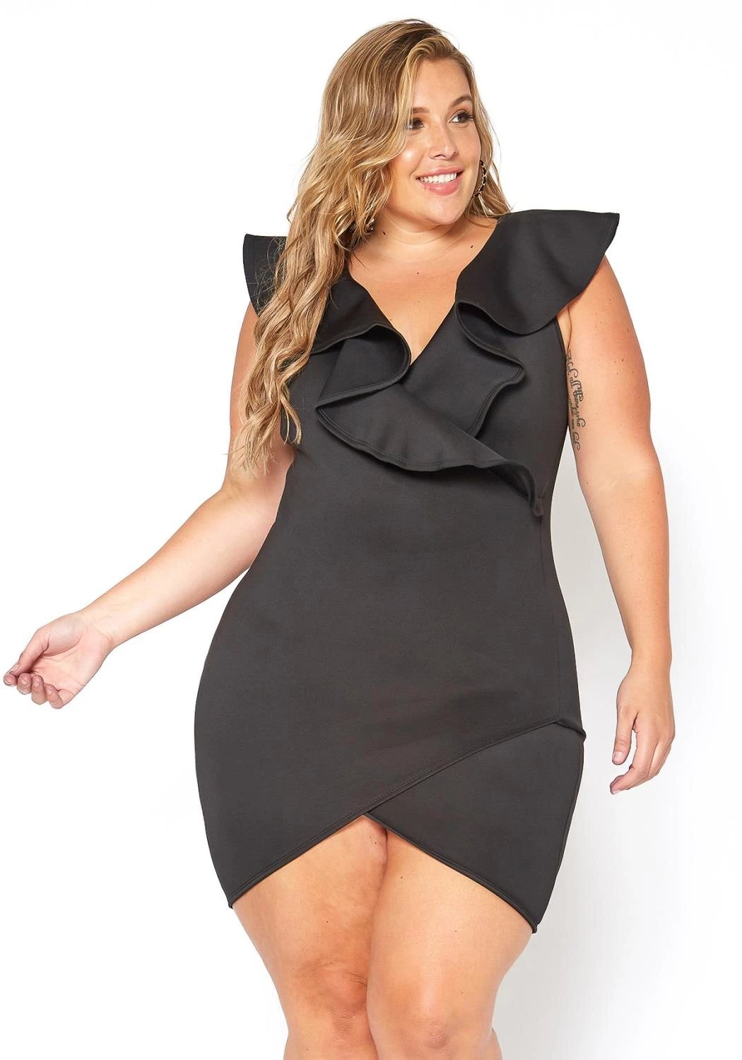 Asoph’s fancy special occasion mini black dress for plus size women which features a ruffle overlay v-neck and asymmetric design front end.