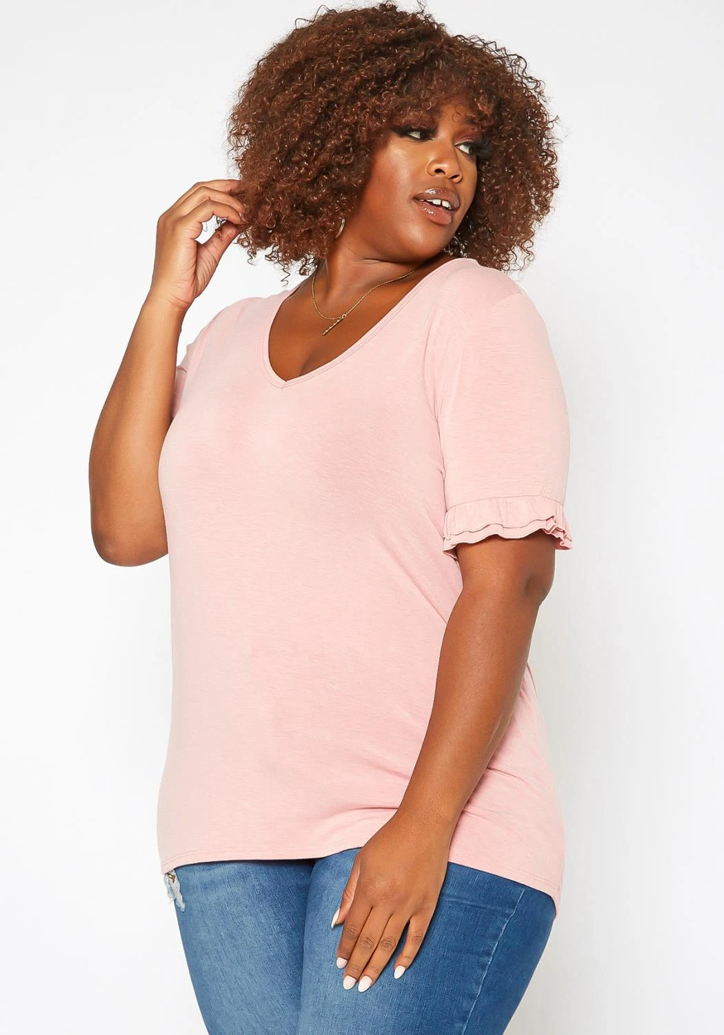Basic plus size women’s t-shirt in v-neck style and ruffle trim short sleeves.