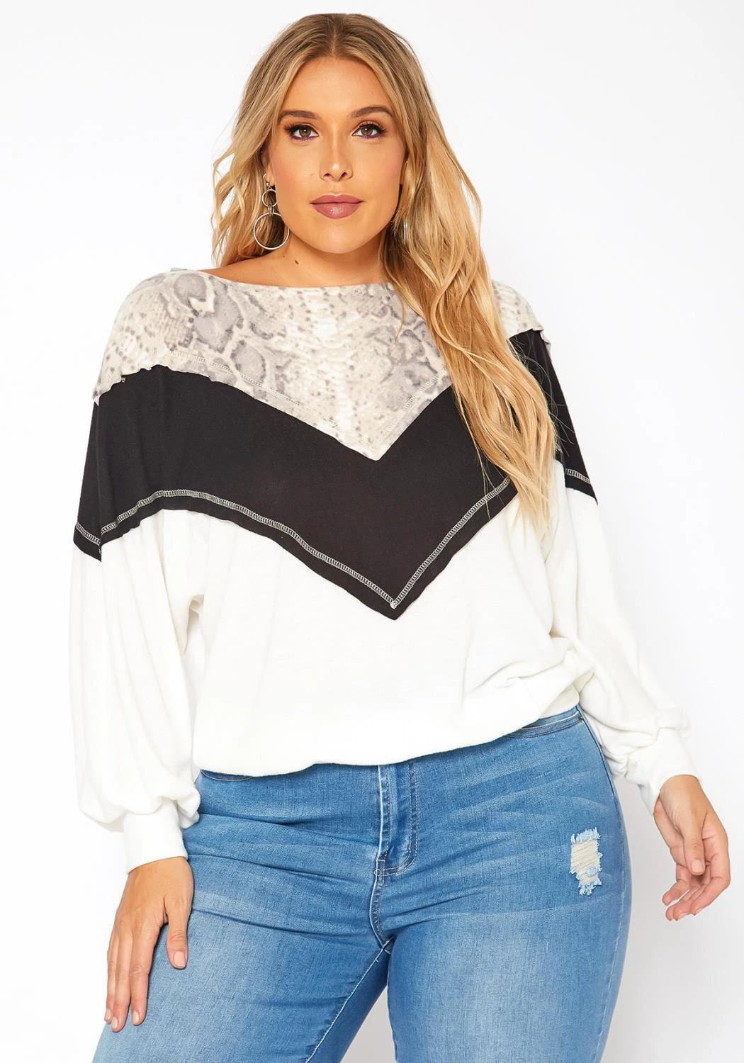Casual plus size women’s knit sweater in chevron color block design with snakeskin pattern, wide neck style and loose long sleeves with fitted wrist cuffs.
