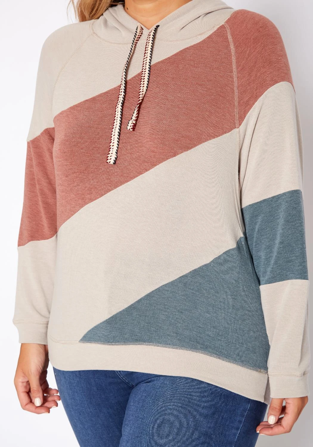 Casual plus size women’s sweater in color splice design, relaxed fit, soft-lightweight material and hooded style.