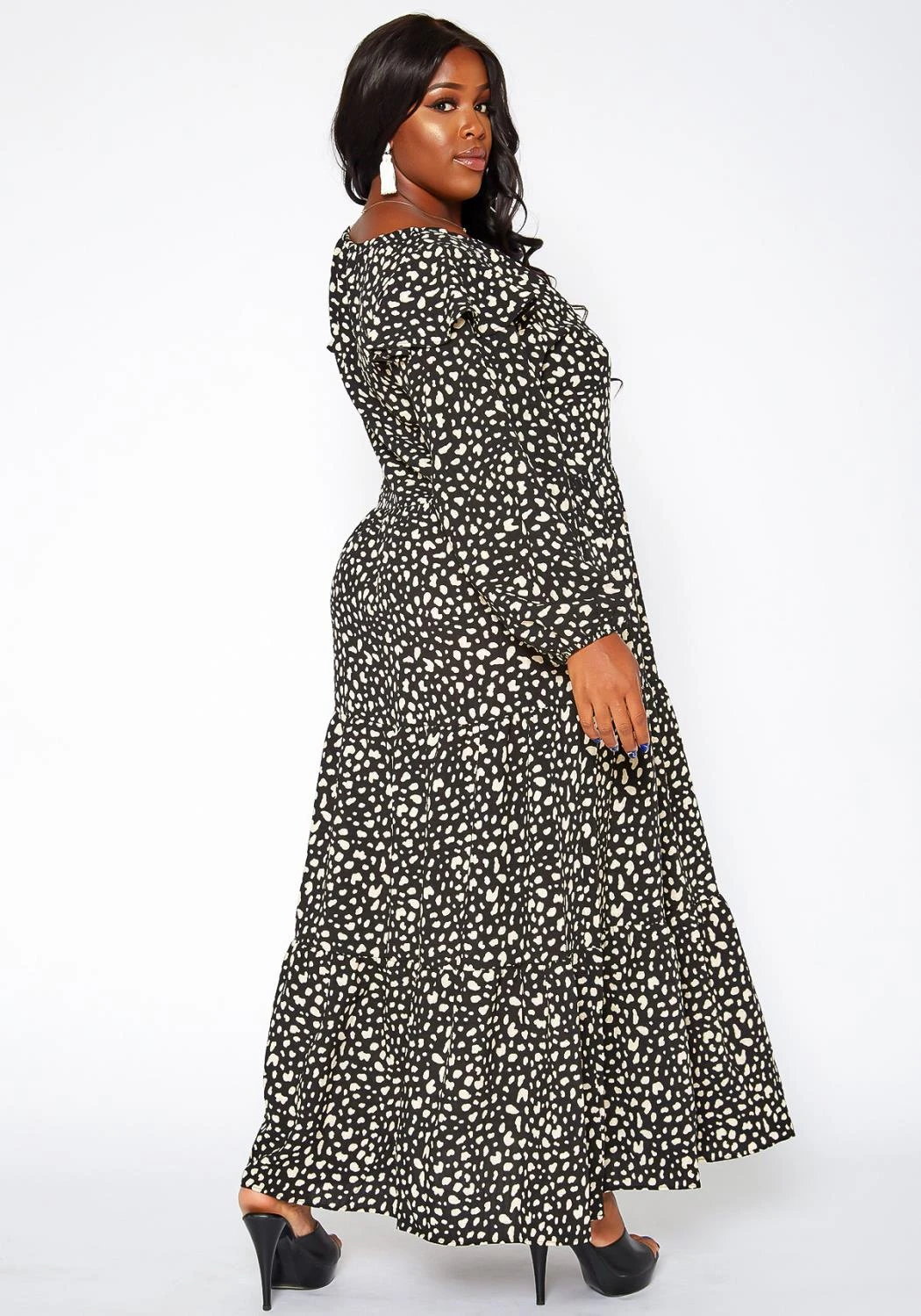 Plus size women’s maxi dress in fit to flare style, loose long sleeves, elastic wrist cuffs, self tie ascent, ruffle trim and spotted print.
