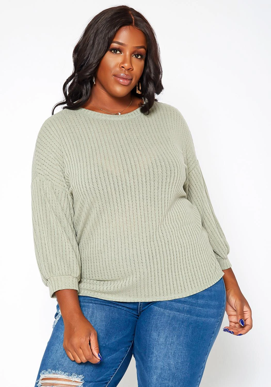 Casual plus size women’s waffle knit sweater in crew neck style, drop shoulder long sleeves, fitted wrist cuffs and open v-back design.