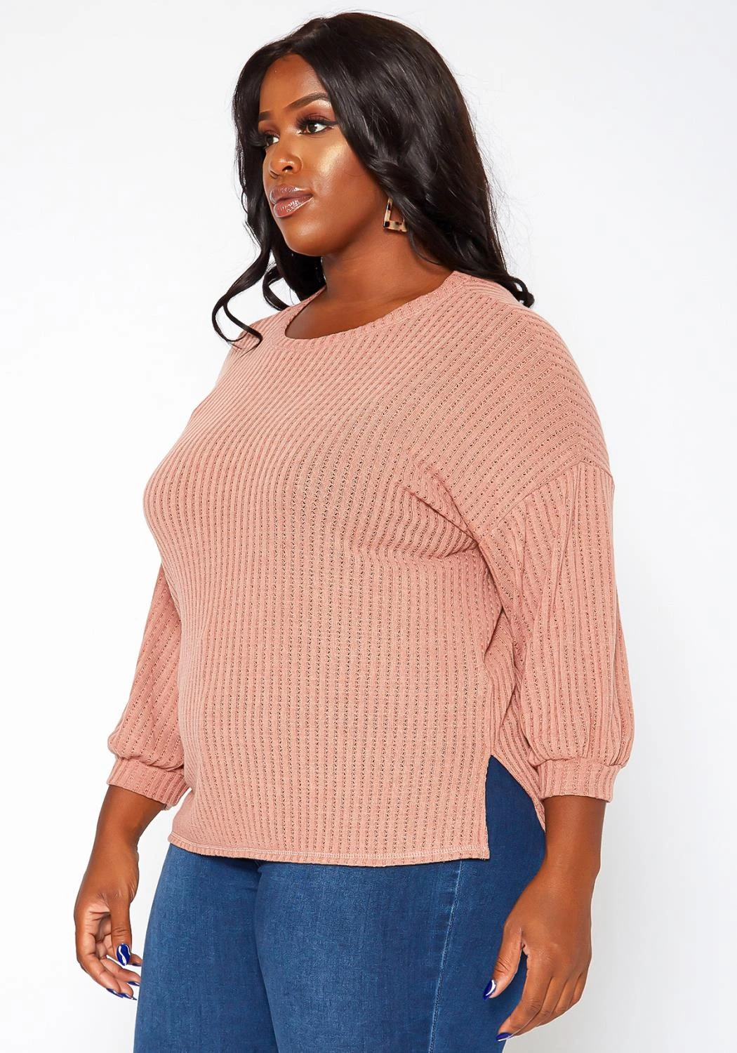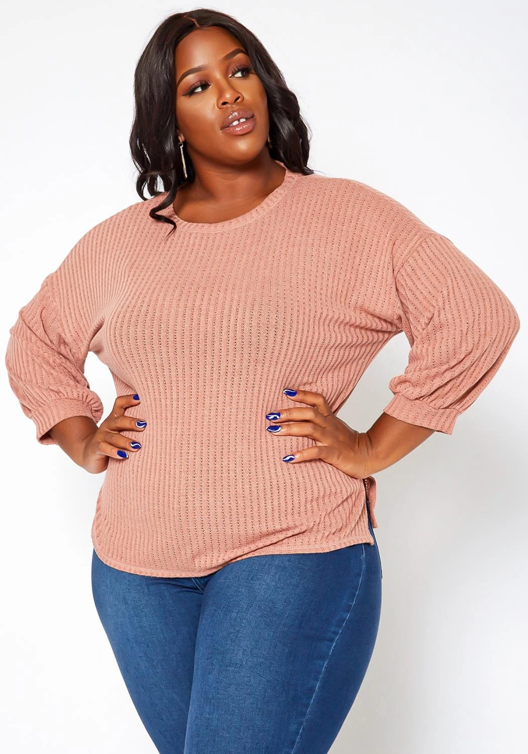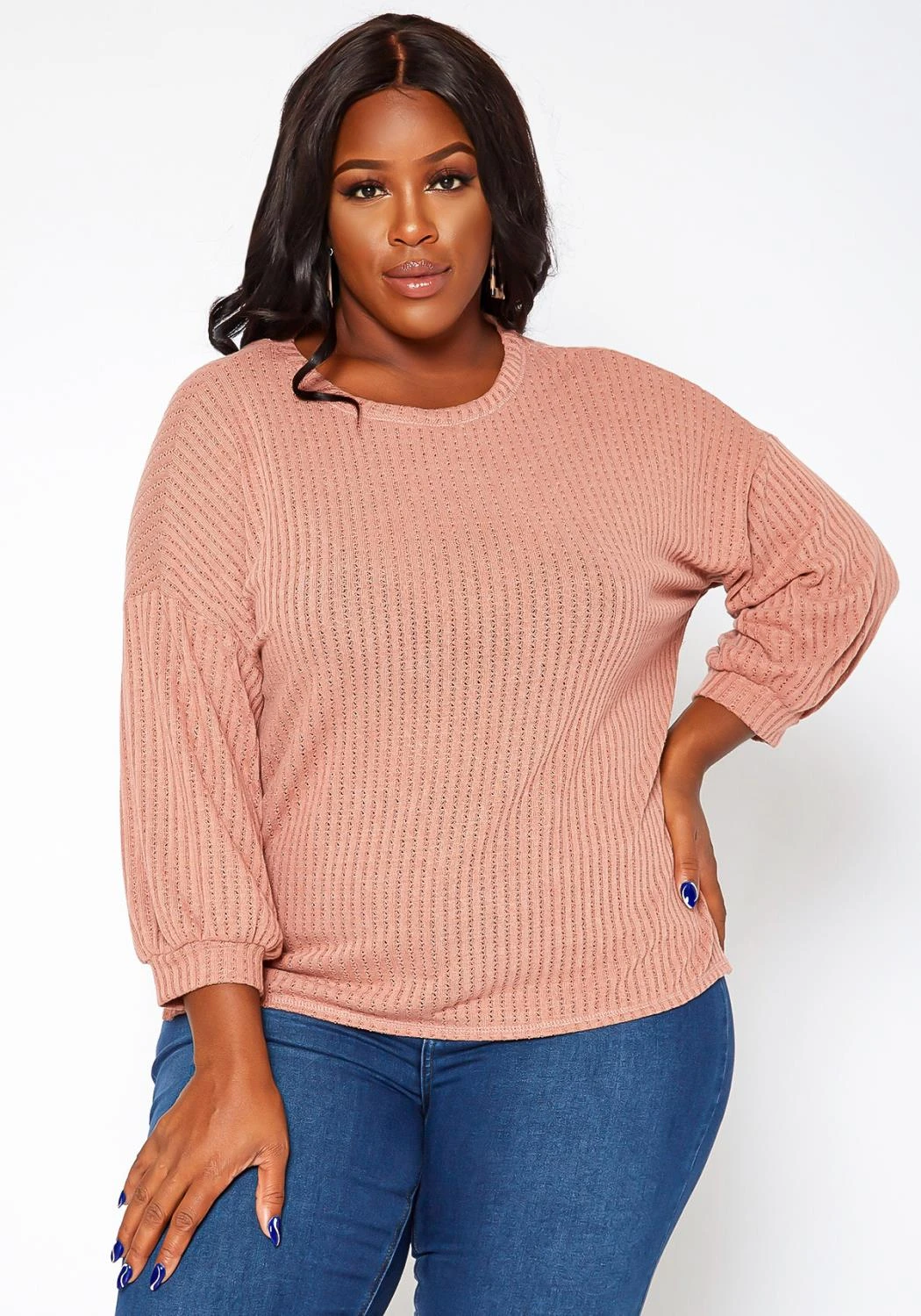 Casual plus size women’s waffle knit sweater in crew neck style, drop shoulder long sleeves, fitted wrist cuffs and open v-back design.
