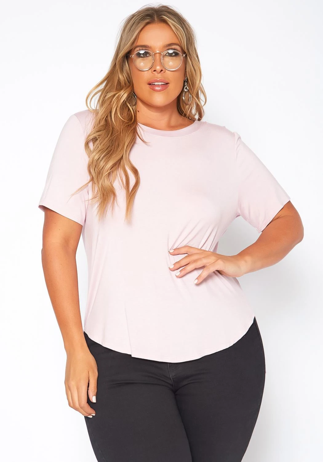 Plus size women’s essential basic t-shirt with unique windowpane back cut-out design, short sleeve, crew neck style and side slit hem.