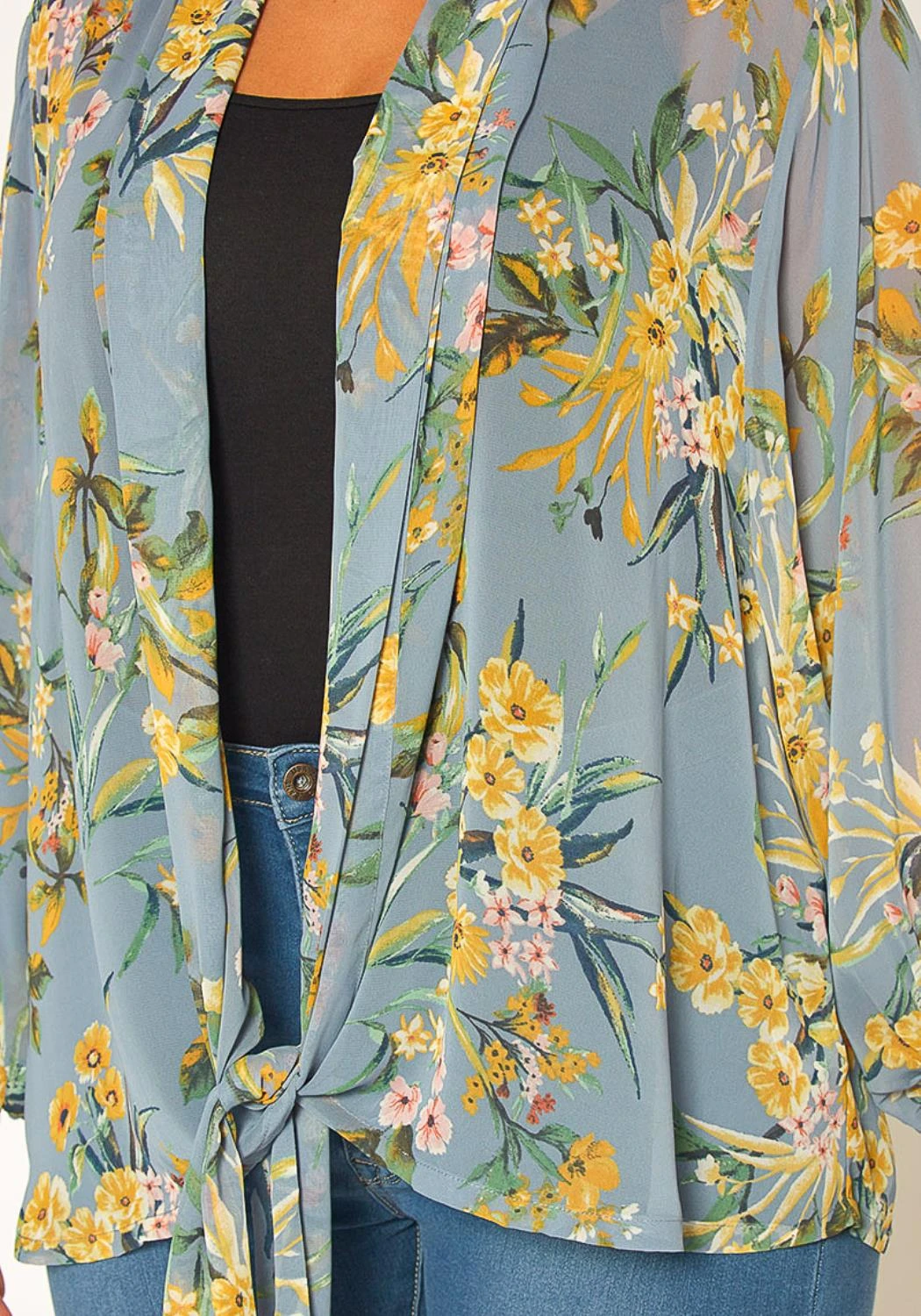 Women’s semi sheer flower printed long sleeve flowy blouse top with tie hem closure.