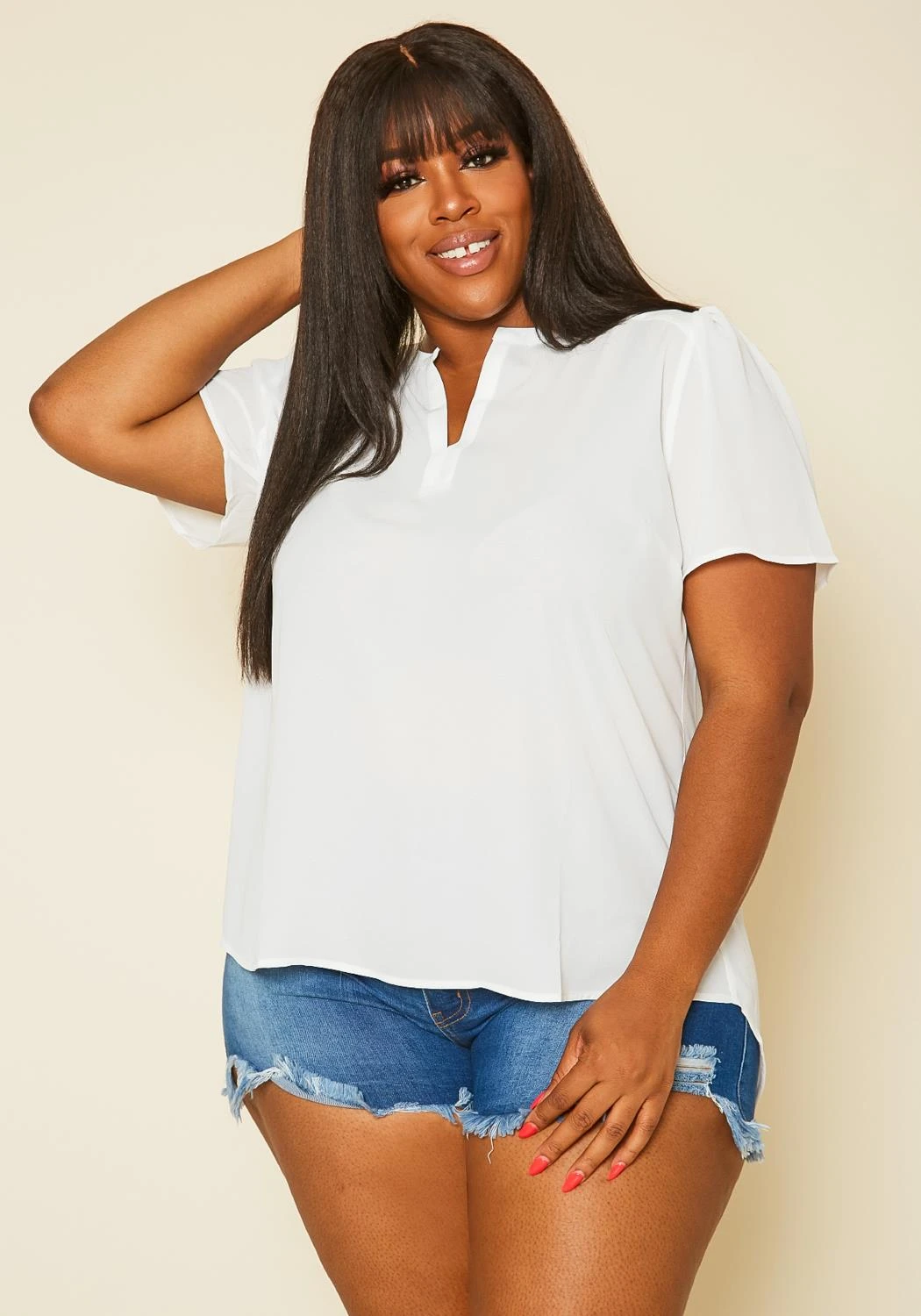 Plus size women’s top, featuring a high low style, v-neck hem & short flounce sleeves.