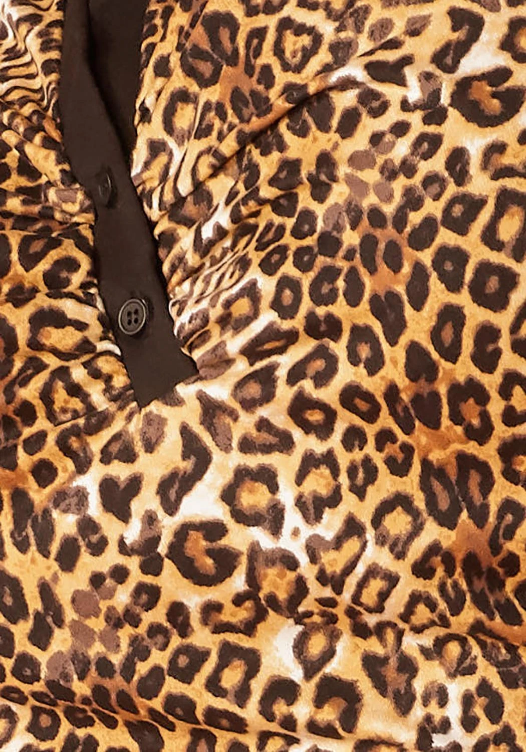 Casual blouse with leopard print and contrast trims. Button up accent for a more sophisticated look.