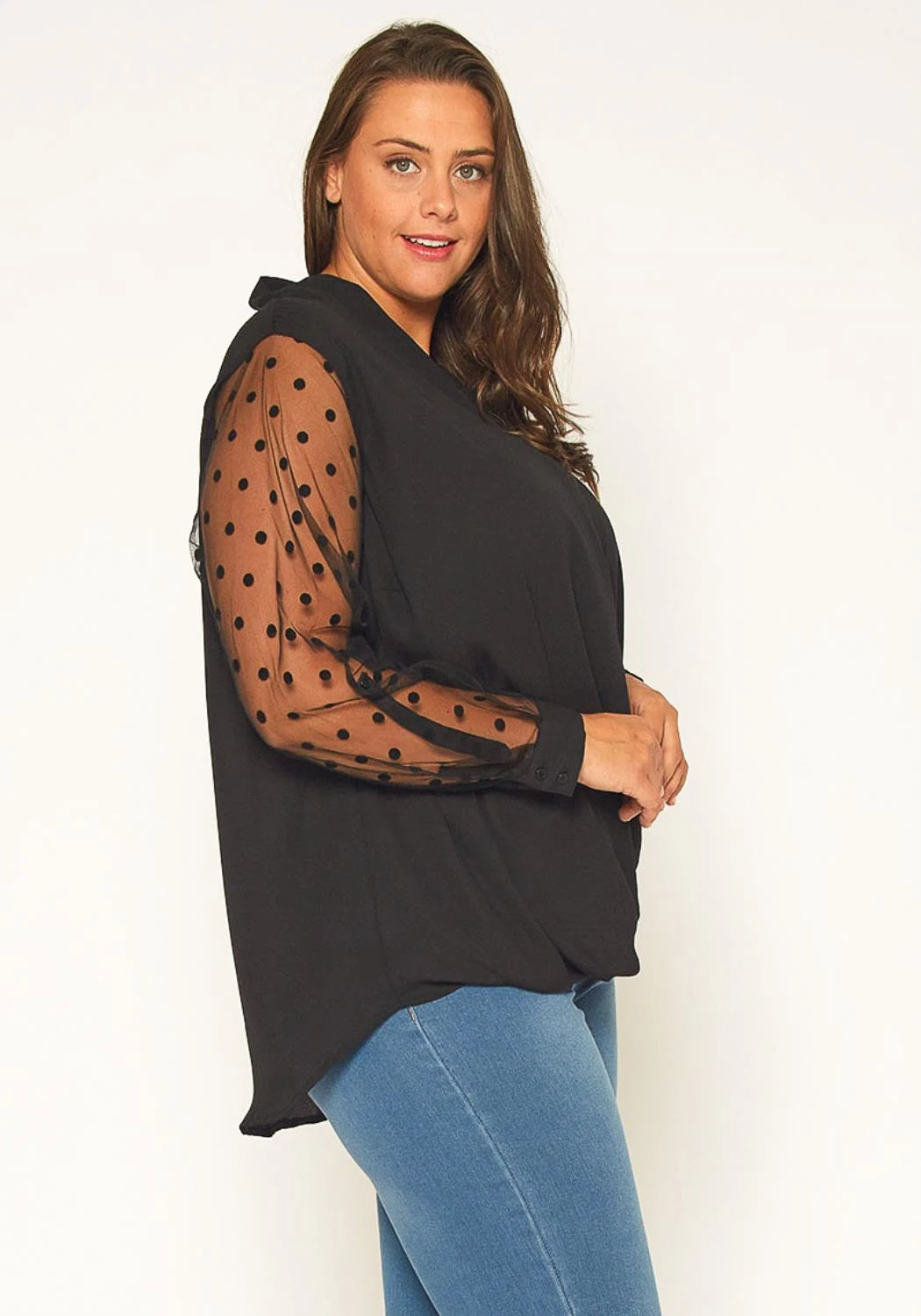 Plus size women’s wrap blouse top with sheer polkadot mesh sleeves.