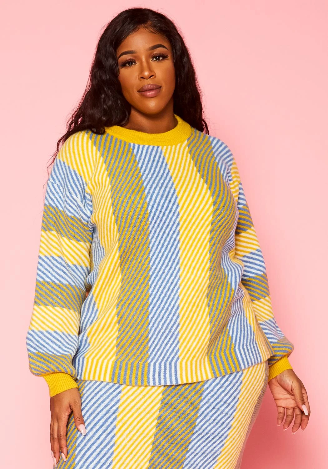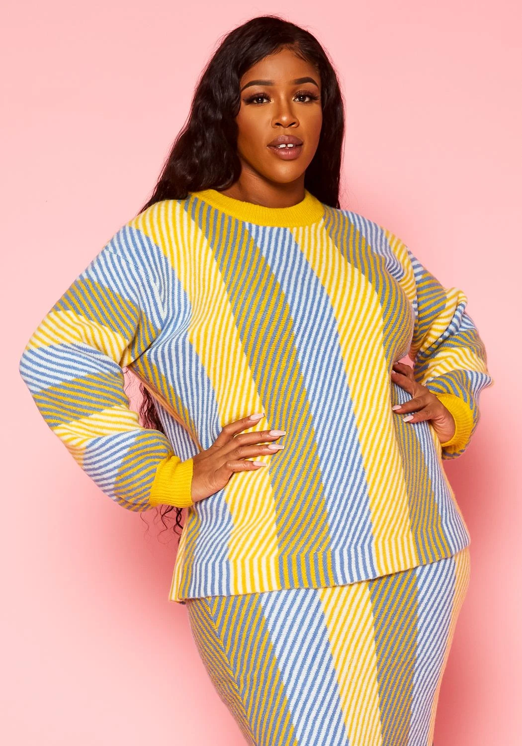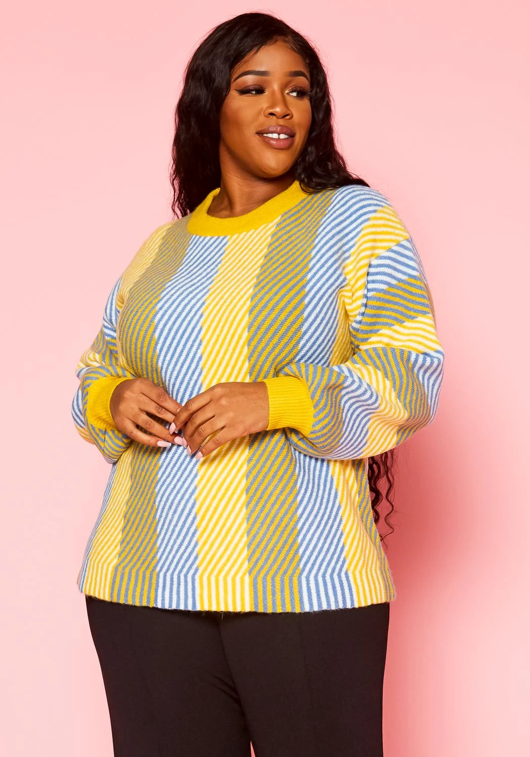 Plus size women’s crewneck thick sweater with multi color bright stripe prints.