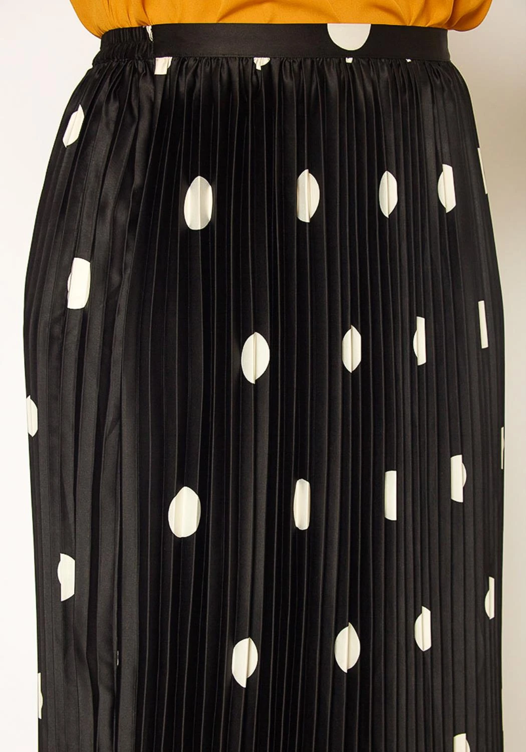 Plus Size women’s polkadot printed pleated midi skirt with elastic waist band.