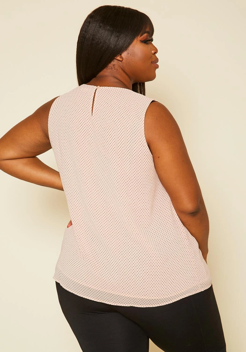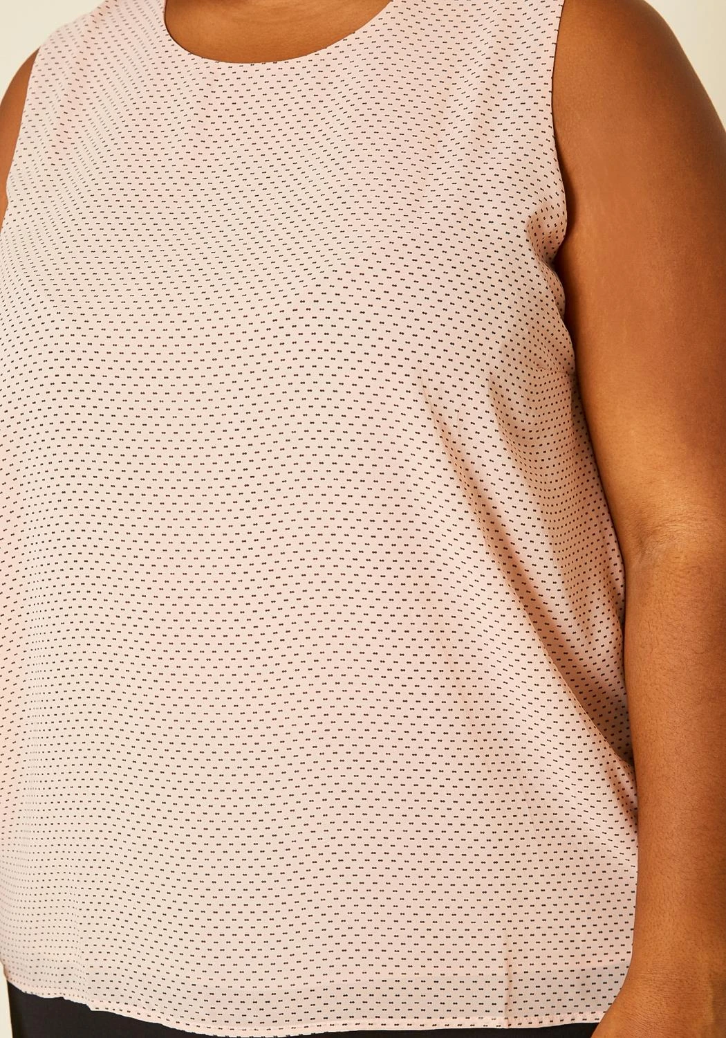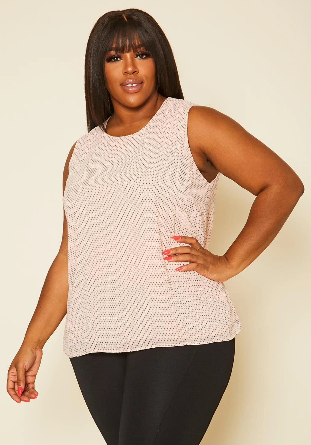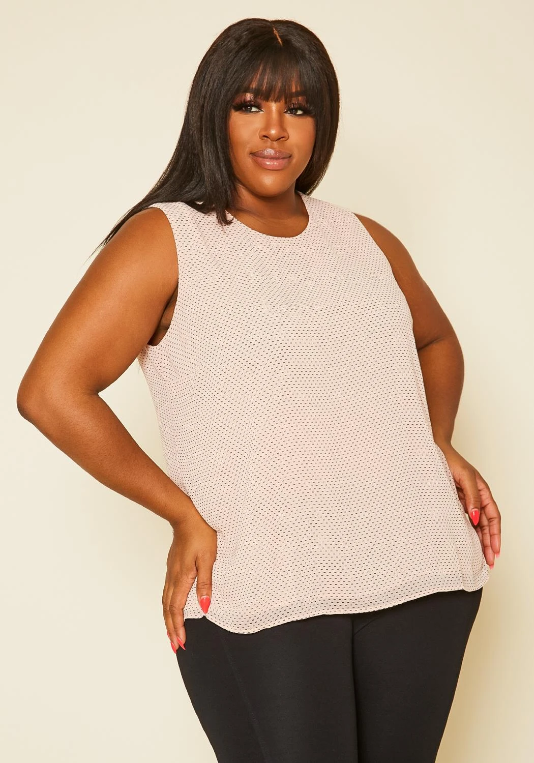 Plus size women’s top in tank style, featuring round neck hem, under lining ascent & back button closure.
