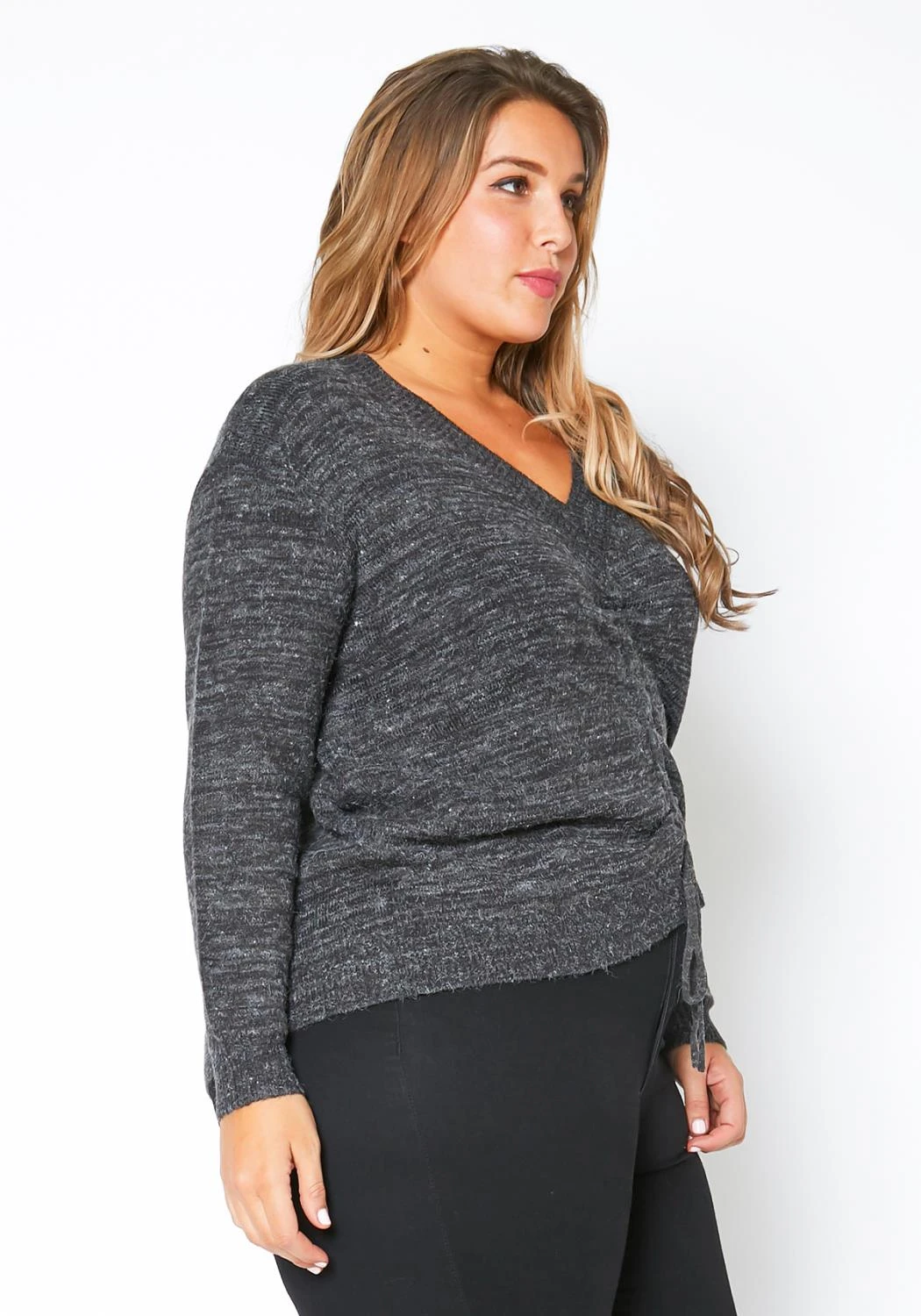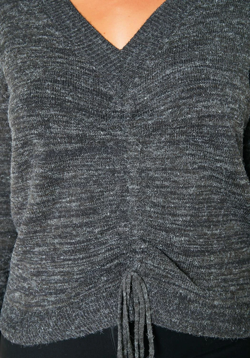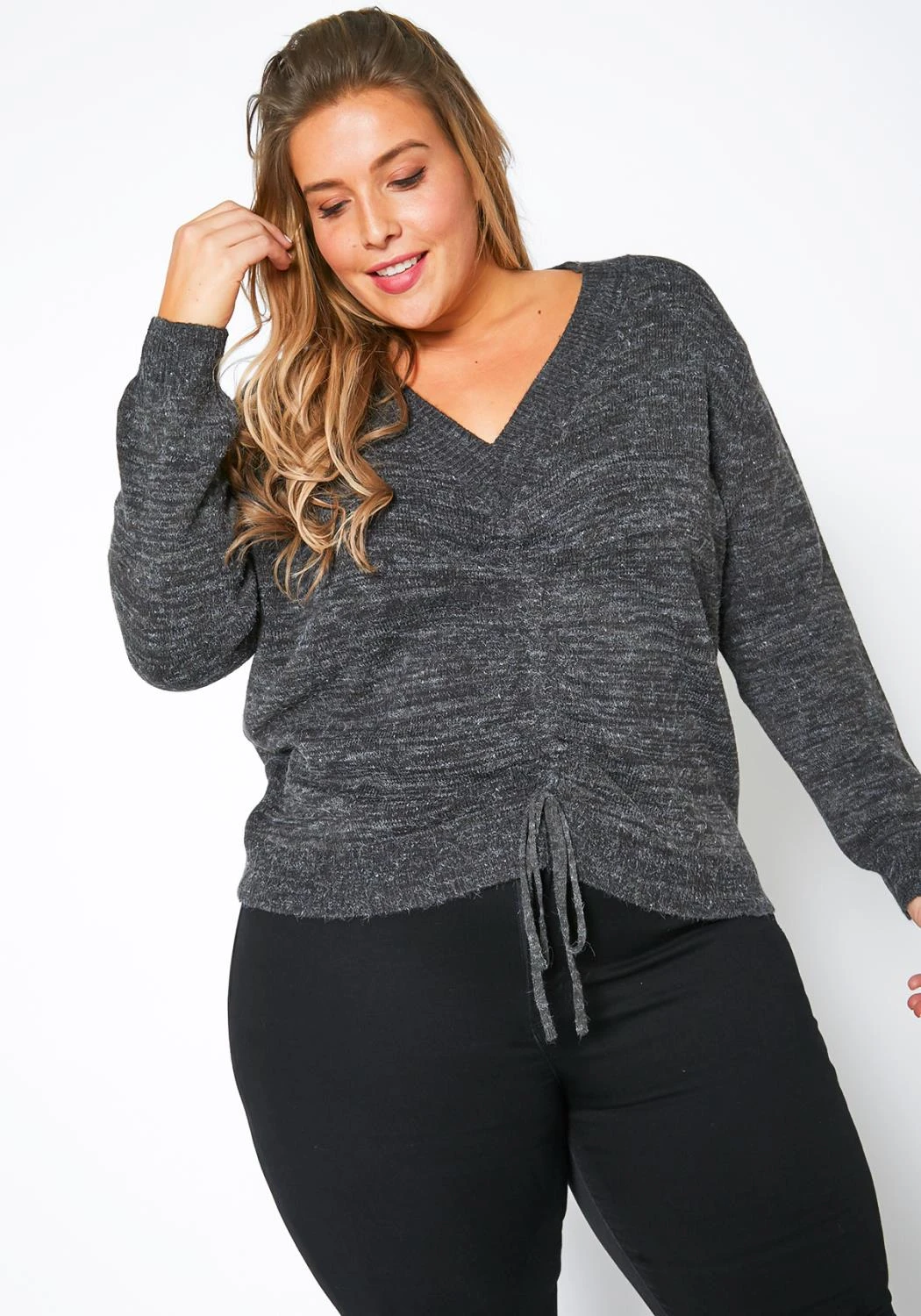 Plus size women’s V-Neck sweater top with adjustable drawstring ruched front hem detail.
