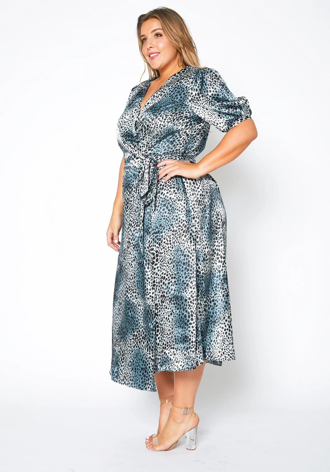 Pleione Plus Size Satin Leopard Wrap Maxi Dress
