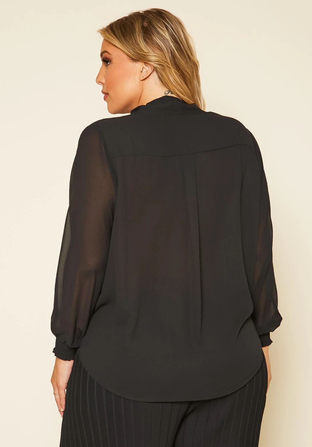 Plus size women’s top featuring a surplice neck hem & sheer long sleeves with shirred cuff hem.