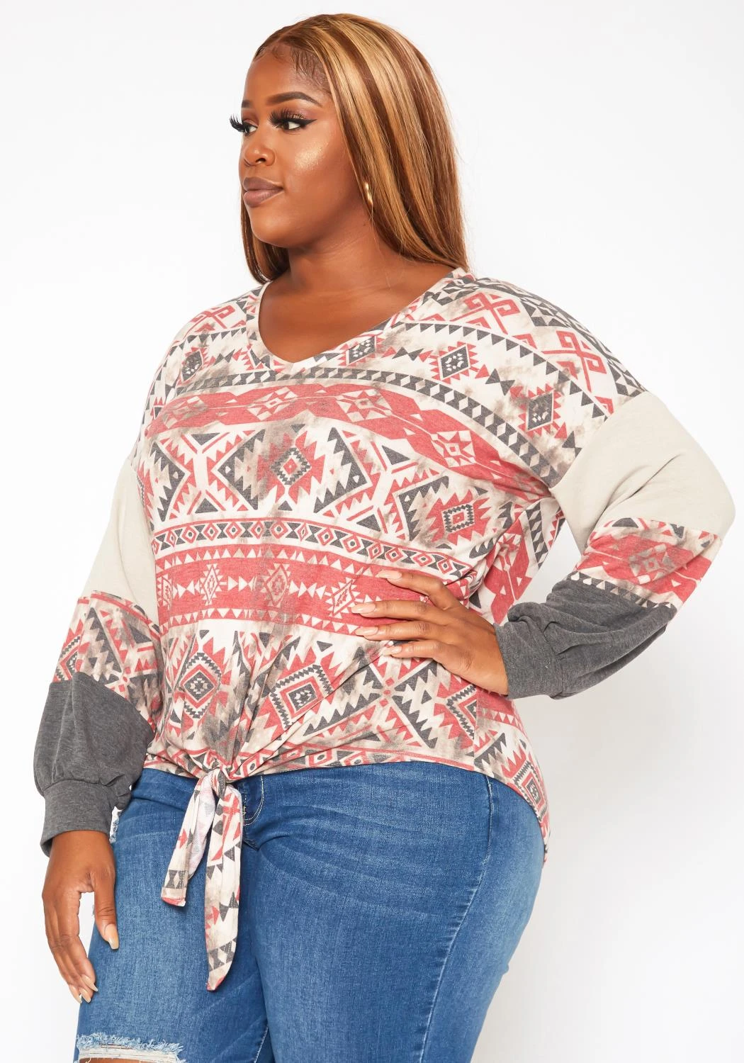 Casual plus size women’s aztec print sweater in v-neck style, low tie-front detail, fitted wrist cuffs and relaxed fitting.