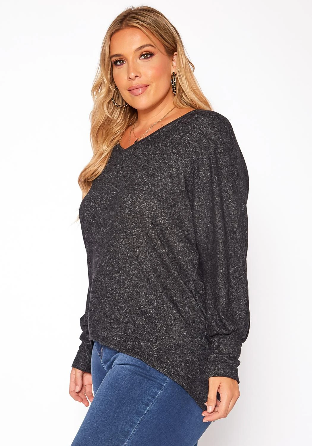 Casual plus size women’s knit sweater in v-neck style and drop shoulder long sleeves with fitted wrist cuffs.