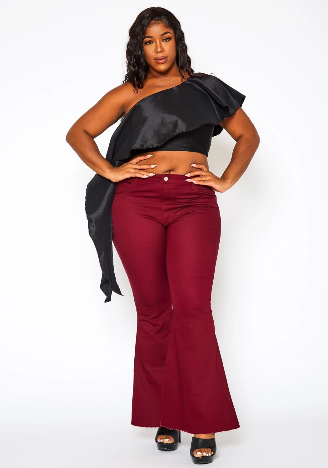 Trendy plus size women’s denim jeans in bell bottom design, low rise hem and belt loop holes.
