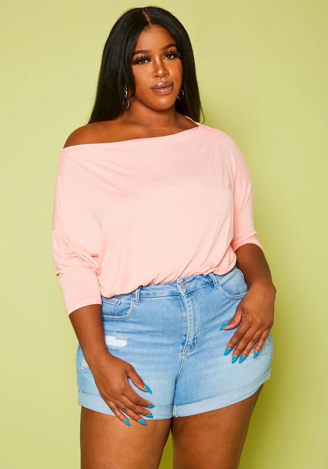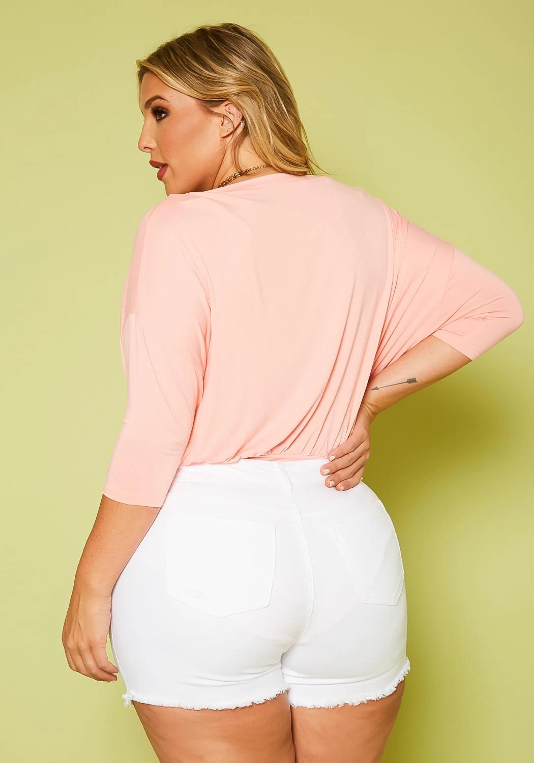 Plus size women’s top in bodysuit style, featuring a boat neck hem, 3/4 sleeves & snap on crotch closure.