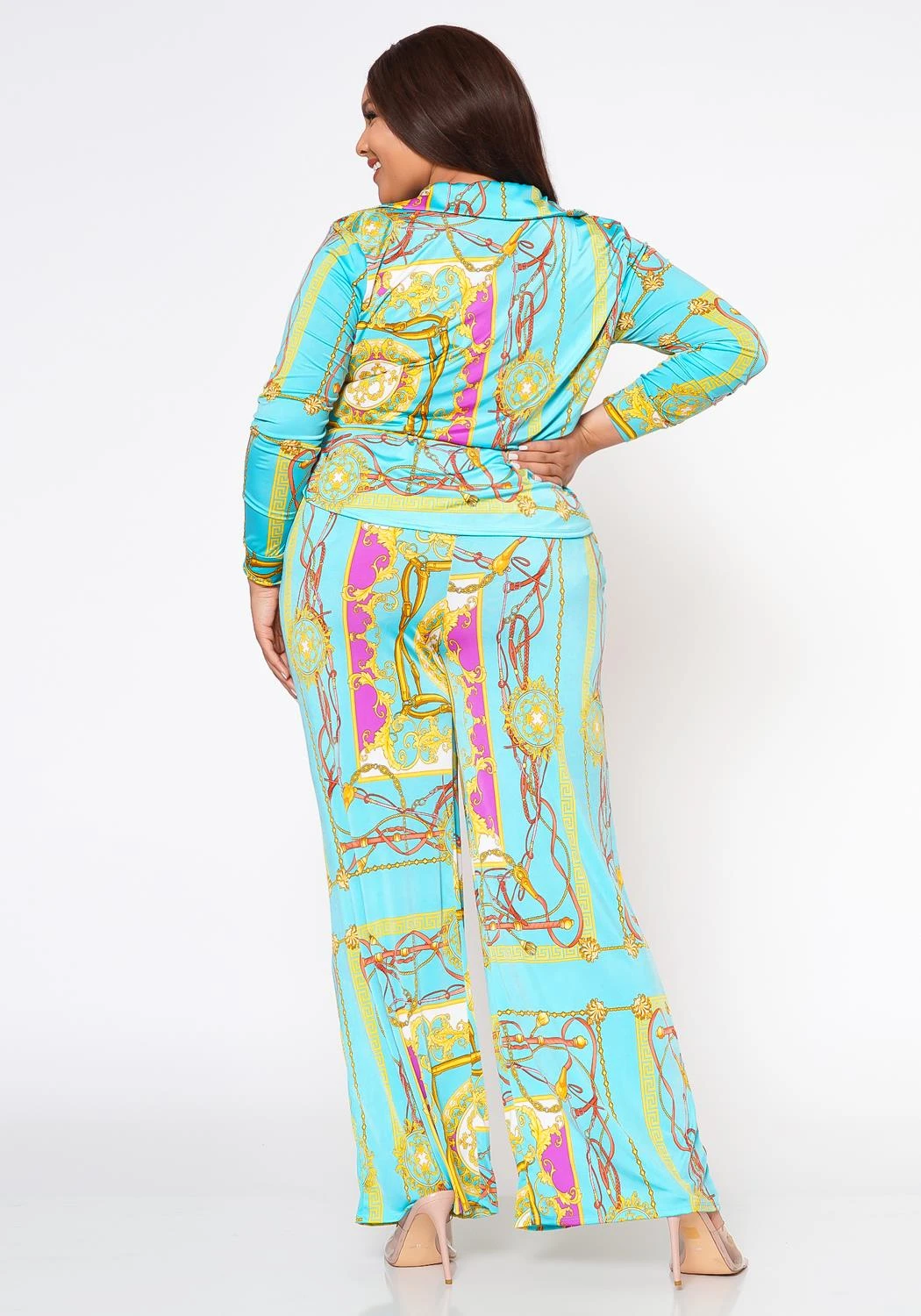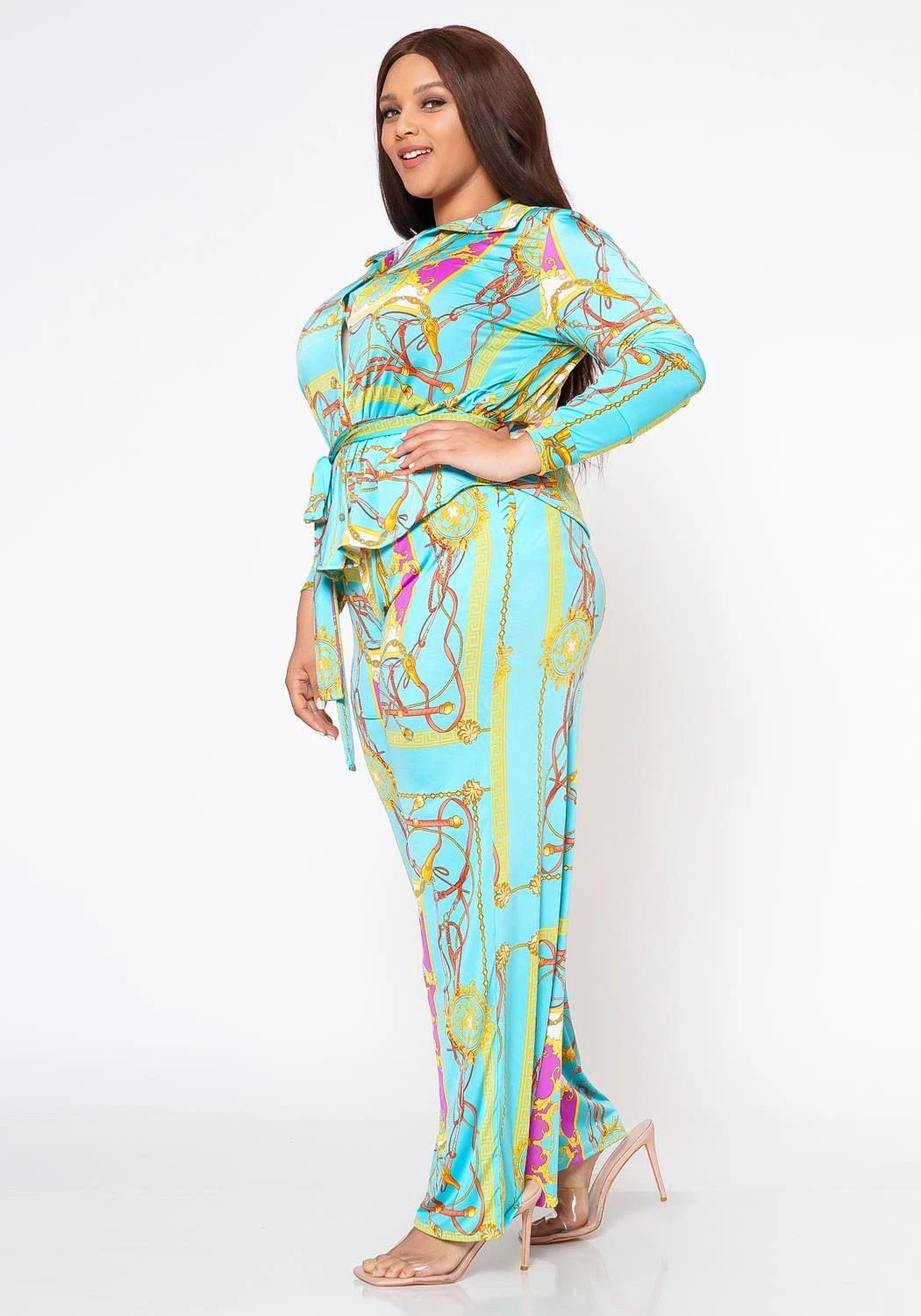 Goal getter plus size women’s set which features flare pants plus matching collared top with front button closure, waist tie hem, 3/4 long sleeves and full length choice.