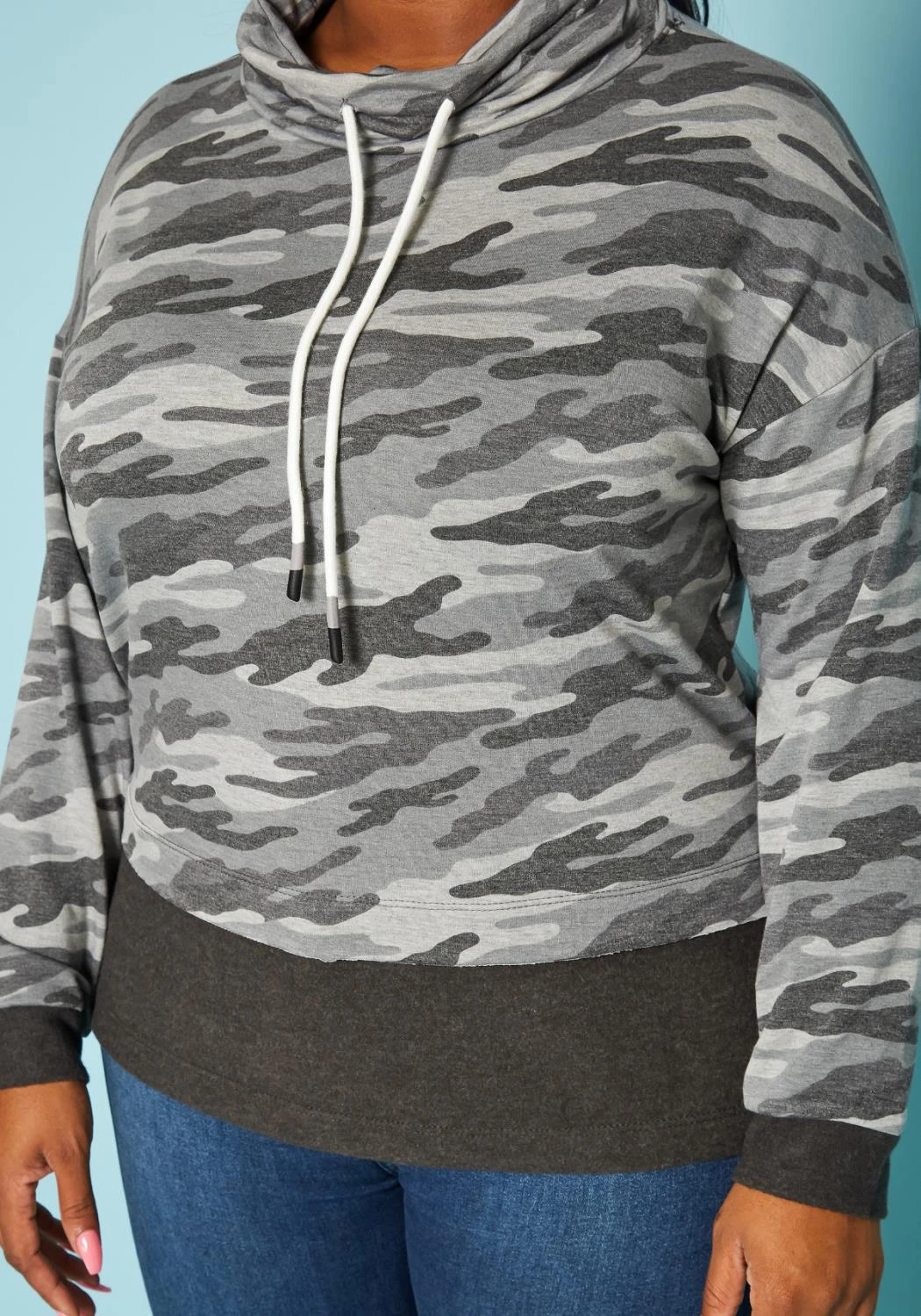 Casual plus size women’s camo pattern sweater in funnel neck style, drawstring hem and fitted wrist cuffs.