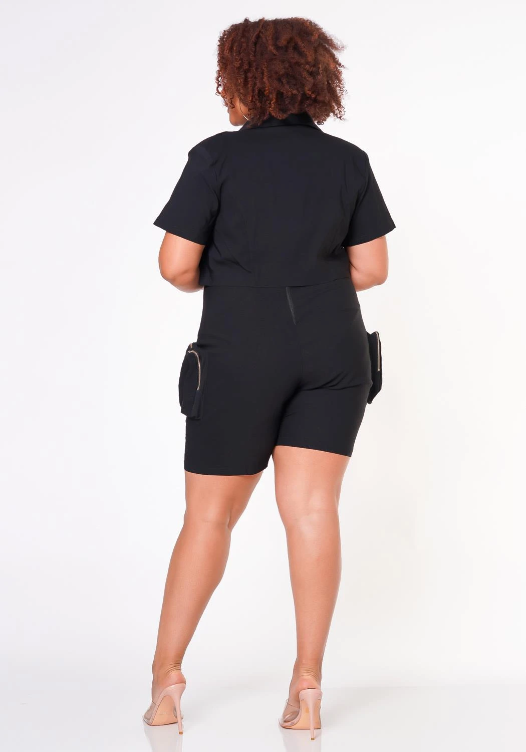 Classy tube cargo romper with cropped short sleeve jacket for plus size woman featuring zipper bottom pockets and back zip up accent.